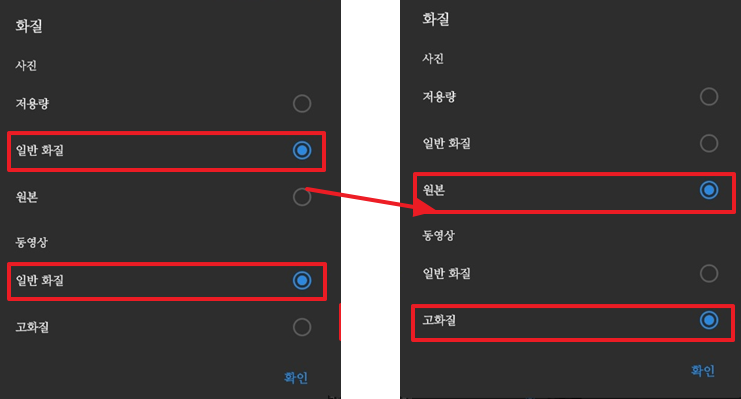 사진전송을 할 때 화질이 안깨지도록 원본 내용을 전달하게되면 데이터를 많이 쓰게되고 사진전송 시간이 길어지다보니 기본 세팅값이 일반화질로 설정이 되어있는데 이것을 원본, 고화질 값으로 바꿔서 확인을 해줘야한다.
