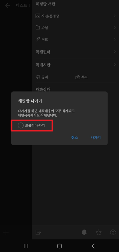 여기서 조용히 나가기에 체크를 하고 나가기를 눌리면 기존에 있는 사람들에게 ooo님이 나갔습니다. 라는 문구가 뜨지 않고 몰래 카카오 단체톡 방을 나갈 수 있게 되는 것이다.