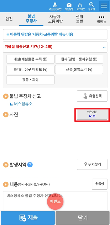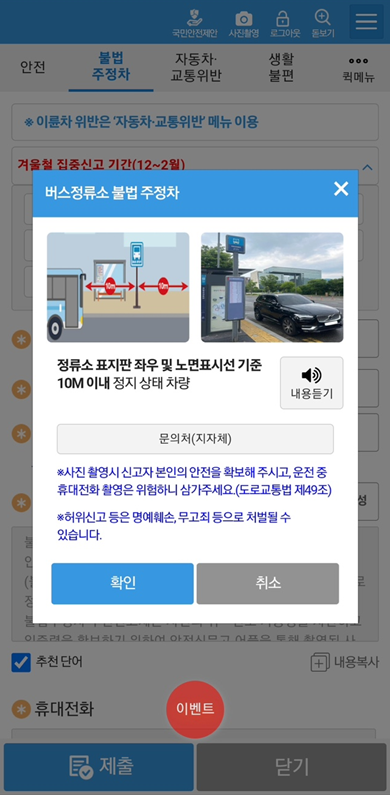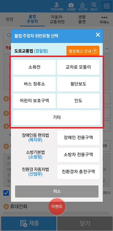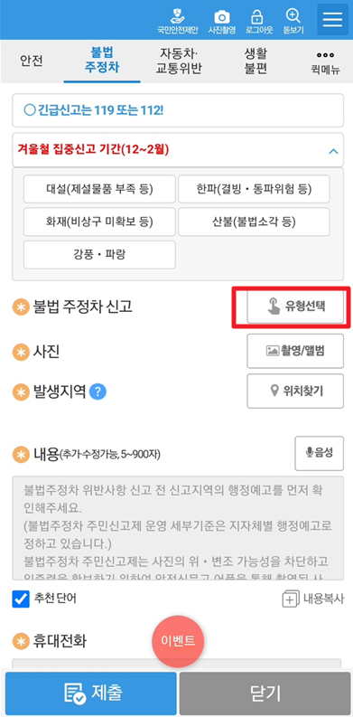 교통위반, 생황불편 등의 신고도 함께 할 수가 있다.