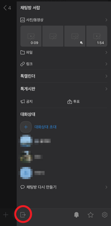 먼저, 나가고 싶은 채팅방에 들어가서 우측 상단에 있는 줄 3개 탭을 눌러준다. 그리고 하단에 있는 나가기 모양을 눌러주면 된다. 채팅방에 들어오지 않고 슬라이드로 채팅방을 나가면 카카오톡 조용히 나가기가 안되니 조심하도록 하자.