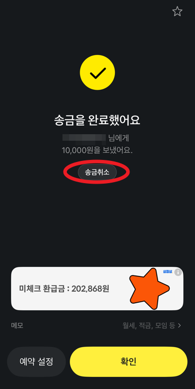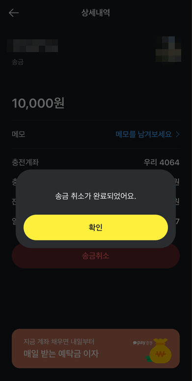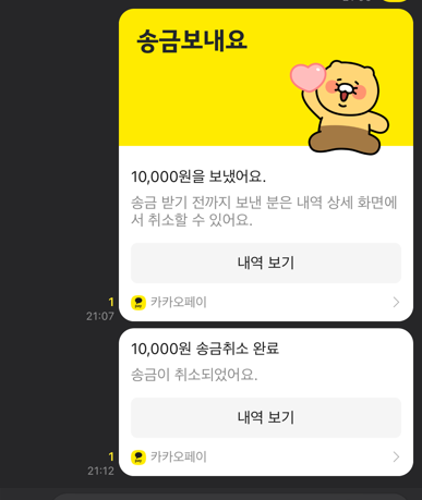 모든 카카오페이 송금 취소는 상대방이 받기 전에 가능하다.