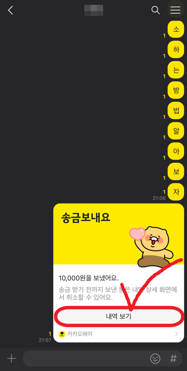 다음 방법으로는 송금했던 상대방의 카톡방에 들어가서 송금한 내역을 확인하는 '내역보기'로 들어가 준다. 들어가게 되면 언제 어떻게 얼마를 보냈는지 확인이 가능한데 여기서 하단에 있는 송금취소 버튼을 누르면 카카오페이 송금 취소가 가능하다. 이것 또한 상대방이 돈을 받기 전에 가능하다.