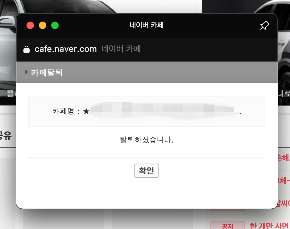 카페 탈퇴하기를 누르면 모바일과 똑같은 문구와 함께 카페를 탈퇴할 수 있다. 분명 내가 가입한 카페가 아닌데 카페명이 바뀌어 다른 카페가 되어 있는 경우가 있을 것이다. 굳이 필요 없는 카페이므로 탈퇴하는 것이 좋다.