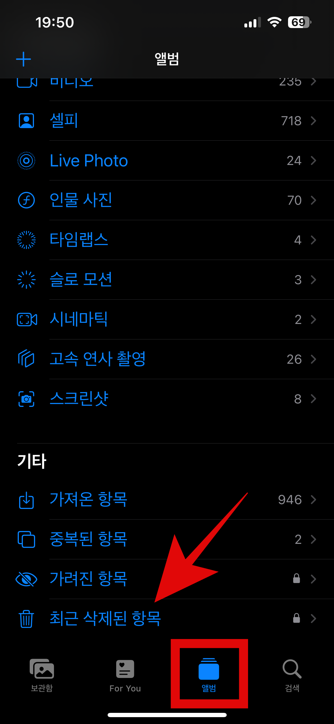 사진을 많이 찍는 사람이라면 여기서 아이폰 저장공간 늘리기가 가장 유리하다. 두 번째 방법으로는 사진을 정리하는 방법이다. 사진을 많이 찍고 많이 정리를 하더라도 아이폰은 바로 삭제가 되지 않고 30일 동안 유지된다. 다시 복구를 하지 않을 사진이라면 영구삭제를 하는 것이 많은 저장공간을 확보할 것이다. 삭제하는 방법은 사진첩에서 하단에 있는 앨범을 눌러주고 스크롤을 제일 밑으로 내려 최근 삭제된 항목에 들어가서 모두 삭제를 해주면 된다.