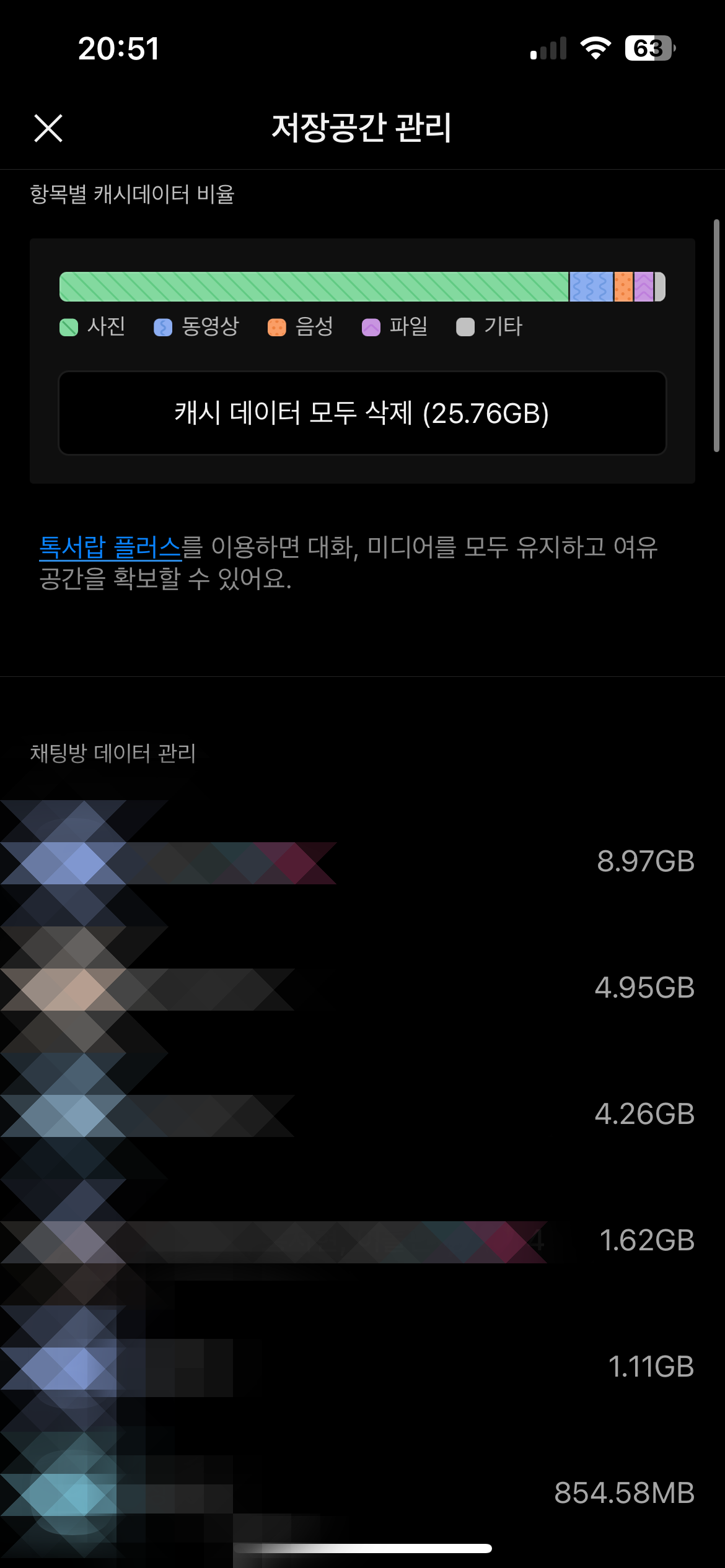그리고 하단에 있는 카카오톡 저장공간 관리로 들어가게되면 어떤 항목이 가장 용량을 많이 차지하는지를 확인할 수 있다. 아래에는 누구와의 카톡방에 얼마나 용량을 사용하고 있는지도 확인이 가능하니 정리할 카톡방을 위 방법과 같이 정리를 해주면 된다. 카톡방을 나가도 정리가 되지만 나가지 않고 정리하는 좋은 방법이다.