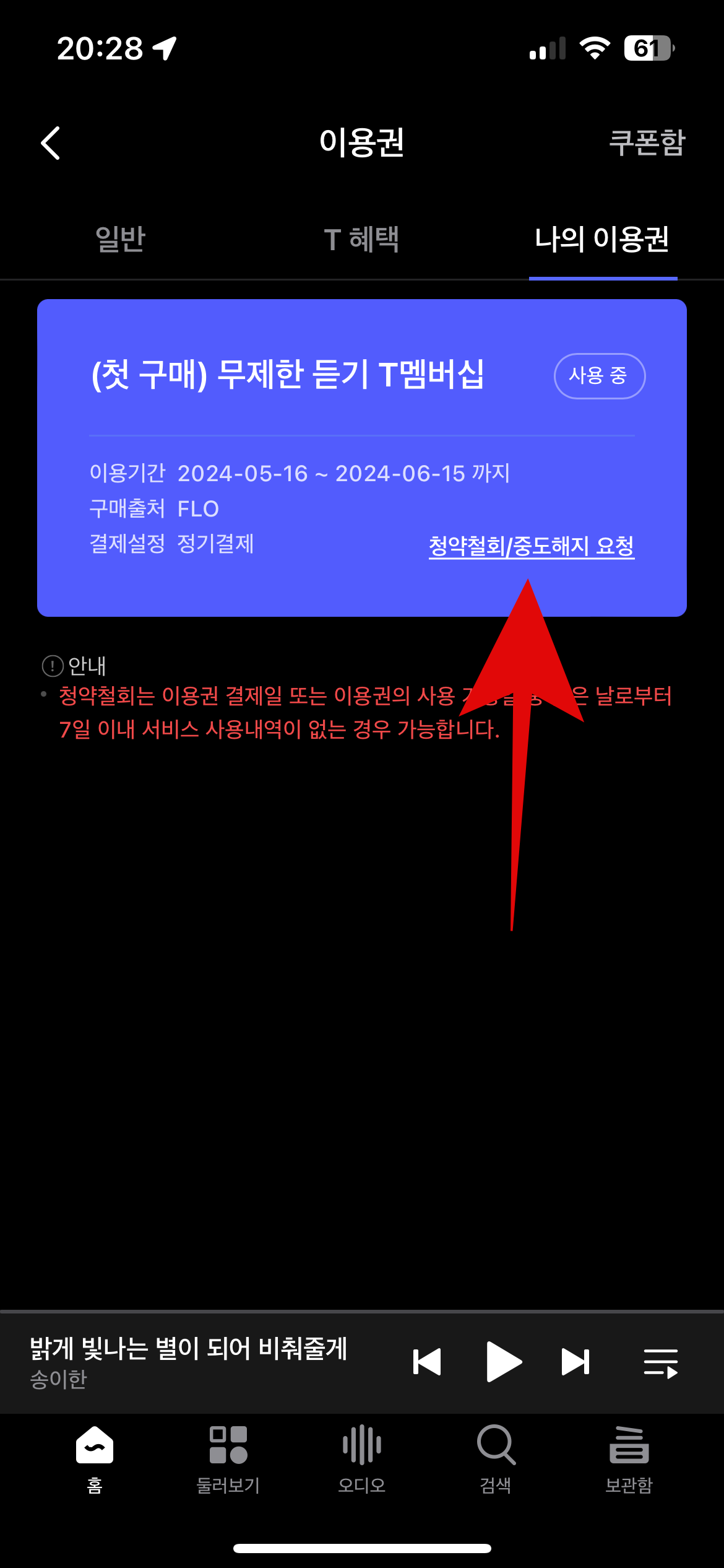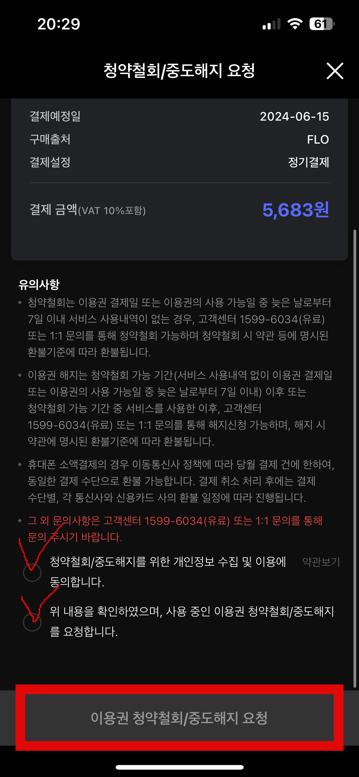 앞서 똑같은 방법으로 들어와서 해지예약이 아니라 청약철회/중도해지를 눌러주도록 하자. flo 이용권 해지하고 싶은 목록에 있는 청약철회/중도해지 요청을 누른다. 그러면 약관을 보고 체크를 한 후 중도해지 요청을 할 수 있다. 이렇게 간단하게 flo 이용권 해지하는 방법과 예약해지 하는 방법에 대하여 알아보았다.