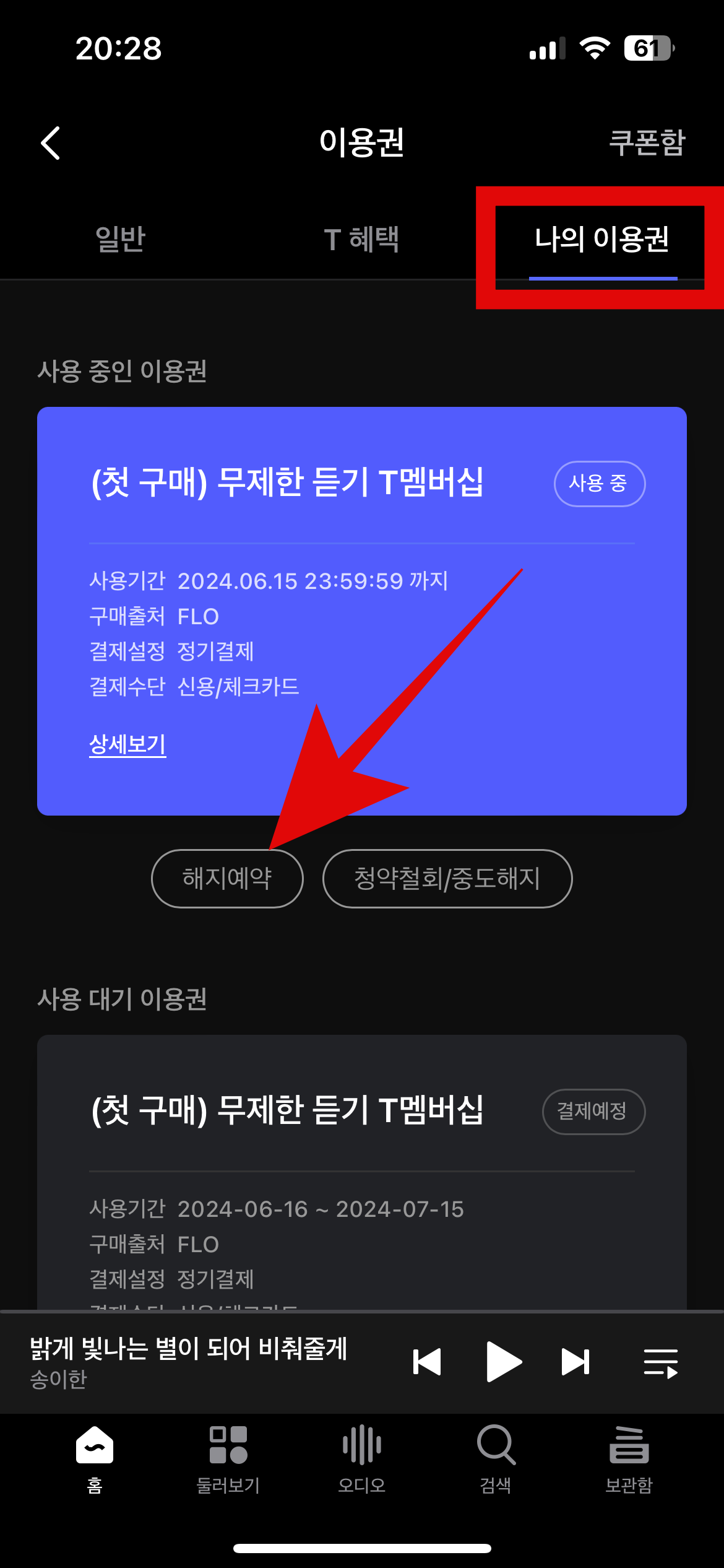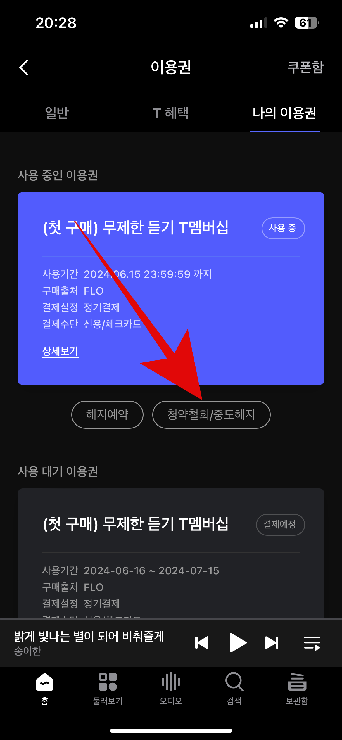 플로 어플에 들어와서 왼쪽 위에 있는 이용권을 누른다. 이용권 설명이 나오는데 여기서 나의 이용권으로 들어가자. 나의 이용권으로 들어오게 되면 내가 현재 사용하고 있는 이용권이 나온다. 스크롤을 내려 중간을 보면 해지예약과 청약철회/중도해지를 볼 수 있는데 flo 이용권 해지 예약을 하기 위해서는 해지예약을 누른다.