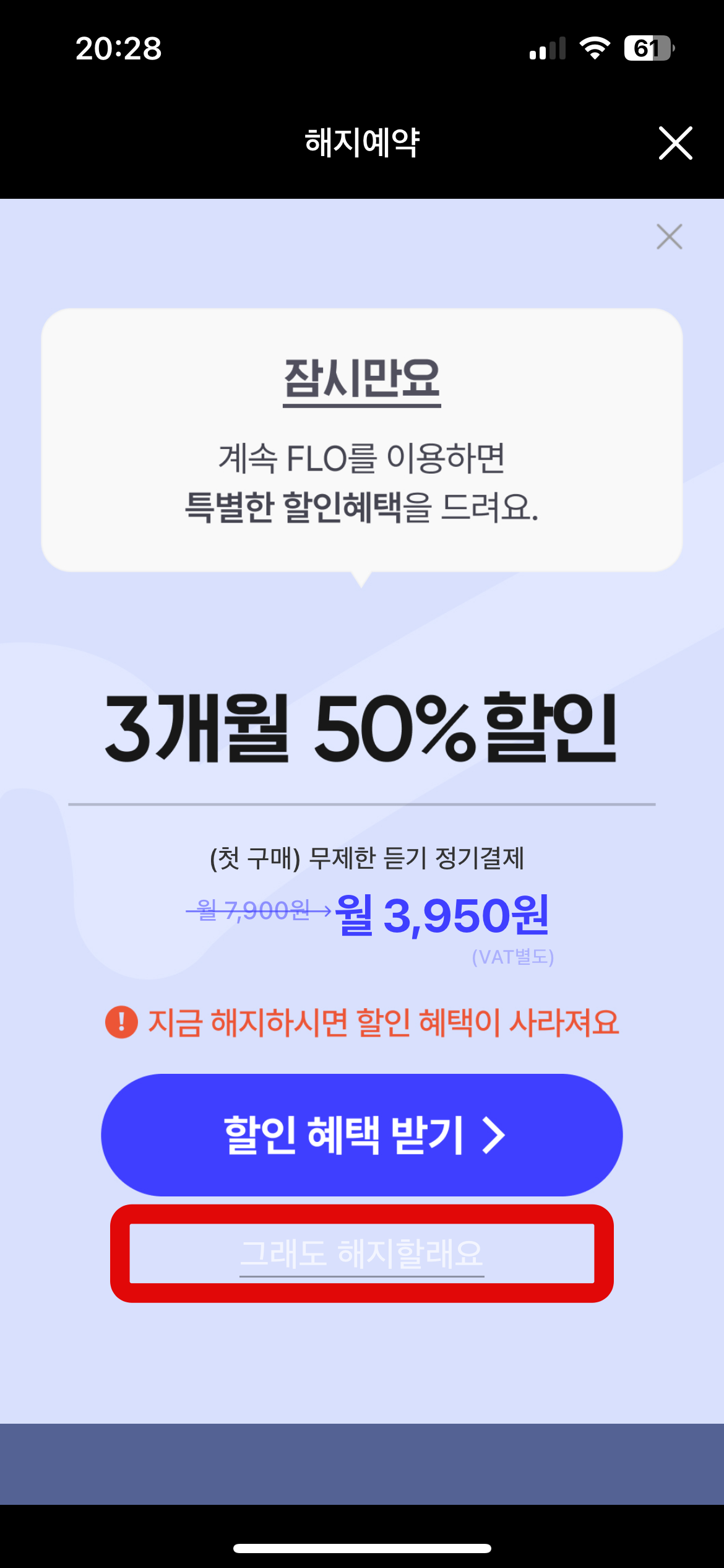 해지예약을 누르니 혜택을 주며 한번 잡는다. 그래도 flo 이용권 해지를 하기 위해서는 그 아래 보이는 '그래도 해지할래요.'를 눌러준다. 다시 한번 물어보지만 해지예약을 누르고 이유를 눌러주면 플로 해지예약이 된다.