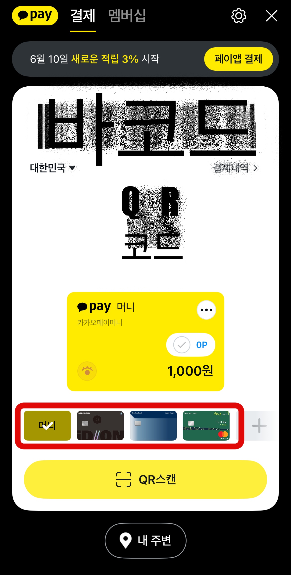 셀프 주유소 카카오페이 바코드는 카카오톡에서 오른쪽 아래에 있는 더보기를 누르고 결제를 누르면 바코드가 나올 것이다. 여기서 바코드를 주유소 바코드 리더기에 읽혀주면 결제가 진행될 것이다. 카카오페이에 신용카드나 체크카드를 등록해 두었다면 원하는 카드를 선택하여 주유소 카카오페이 결제를 진행해도 된다.