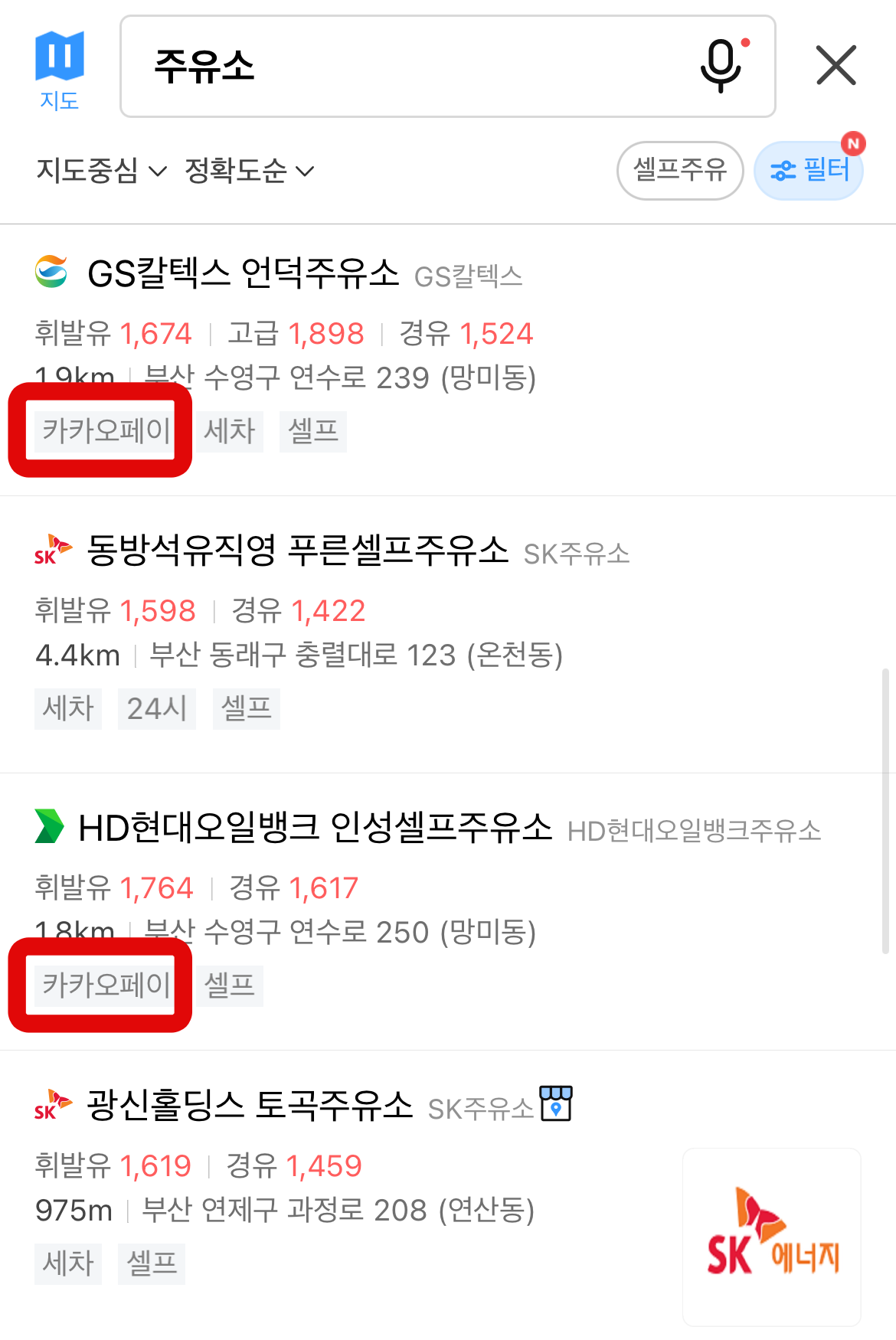 카카오맵 어플을 다운하여 주유소라고 검색해 보면 태그에 카카오페이라고 적혀 있는 것을 볼 수 있을 것이다. 저렇게 적혀있는 지점은 주유소 카카오페이가 무조건 가능하며 적혀있지 않은 지점도 가끔 가능한 지점이 있다. 기름이 많이 부족하다면 검색하여 카카오페이가 가능한 주유소로 가는 것이 가장 정확하다.