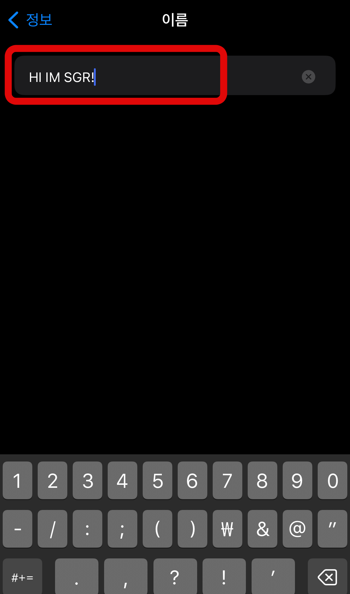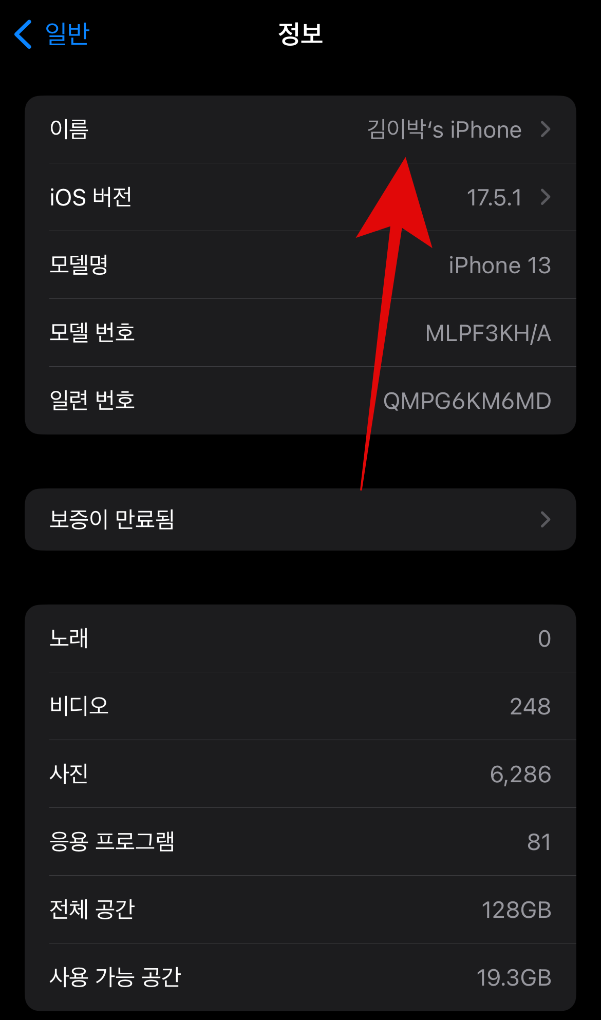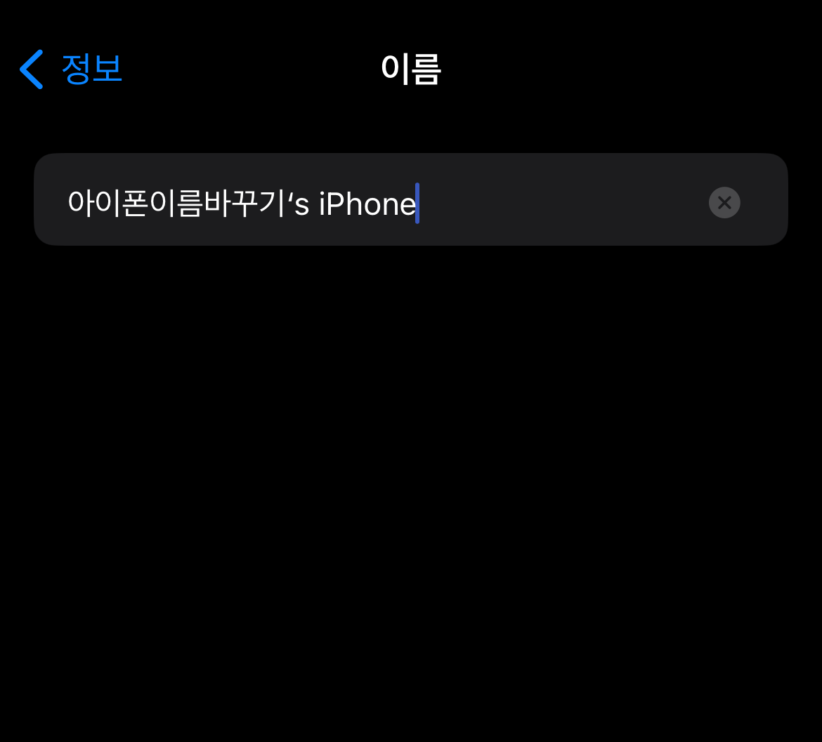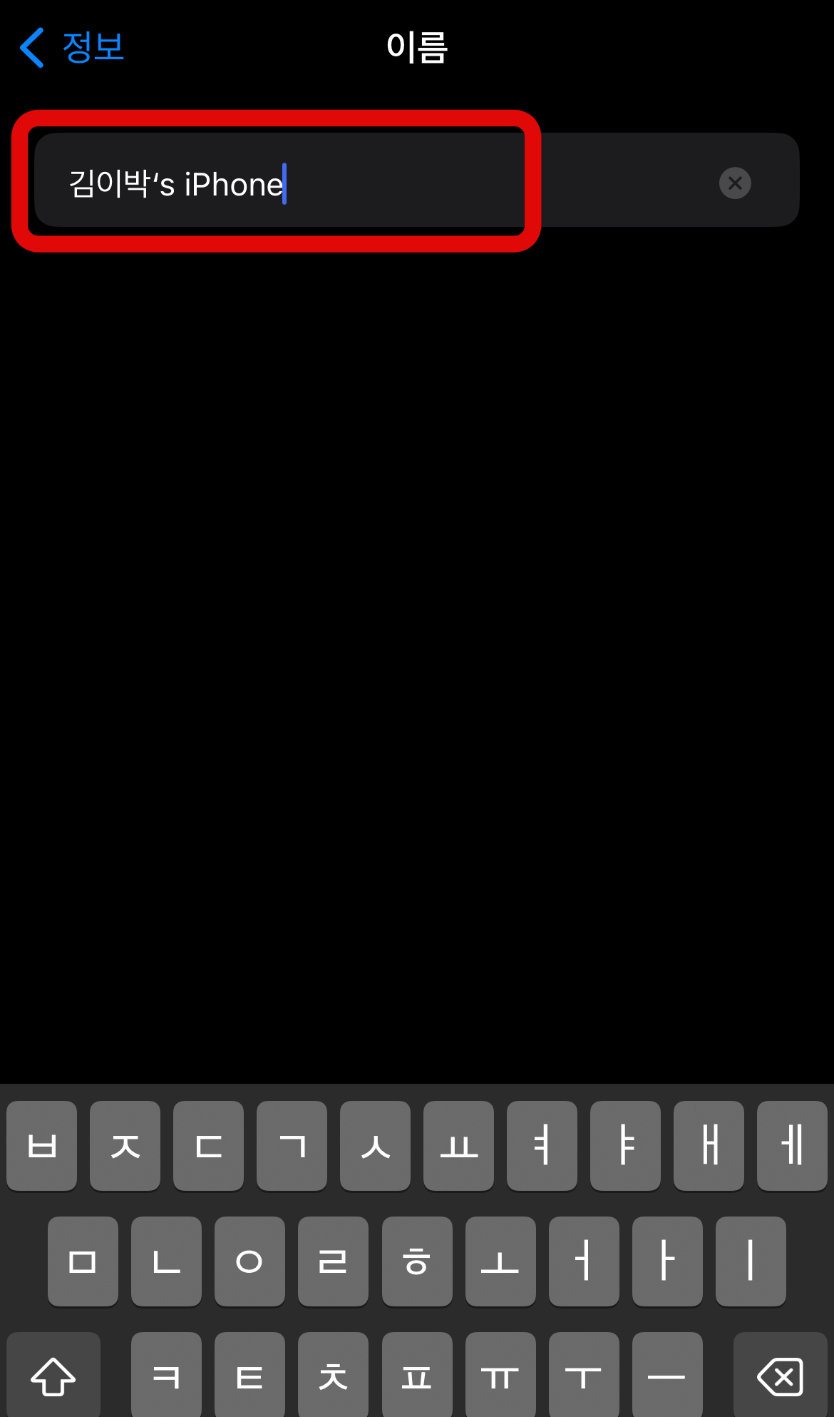 정보에 들어가게 되면 나의 아이폰에 대한 정보가 모두 나온다. 가장 상단에 있는 이름에 들어가서 원래 사용하던 이름을 지우고 원하는 이름으로 바꾸게 되면 아이폰 이름 바꾸기가 성공적으로 이루어진다. 특수문자도 사용이 가능하니 나만의 아이폰 애칭으로 저장할 수 있다.