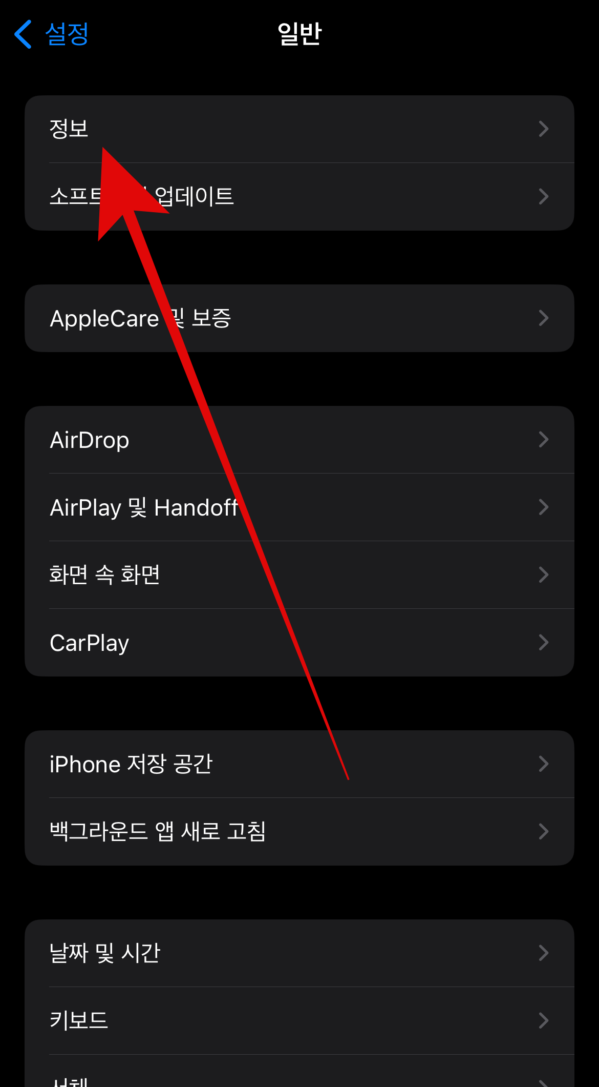 아이폰 이름 바꾸기 위해서 설정에서 자신의 이름(Apple ID)으로 들어가는 경우가 많은데, 아이폰 이름 바꾸기 위해서는 설정에서 일반으로 들어가야 한다. 일반에서는 다양한 기본 설정을 할 수 있는데 여기서 가장 상단에 있는 정보로 들어가도록 하자.