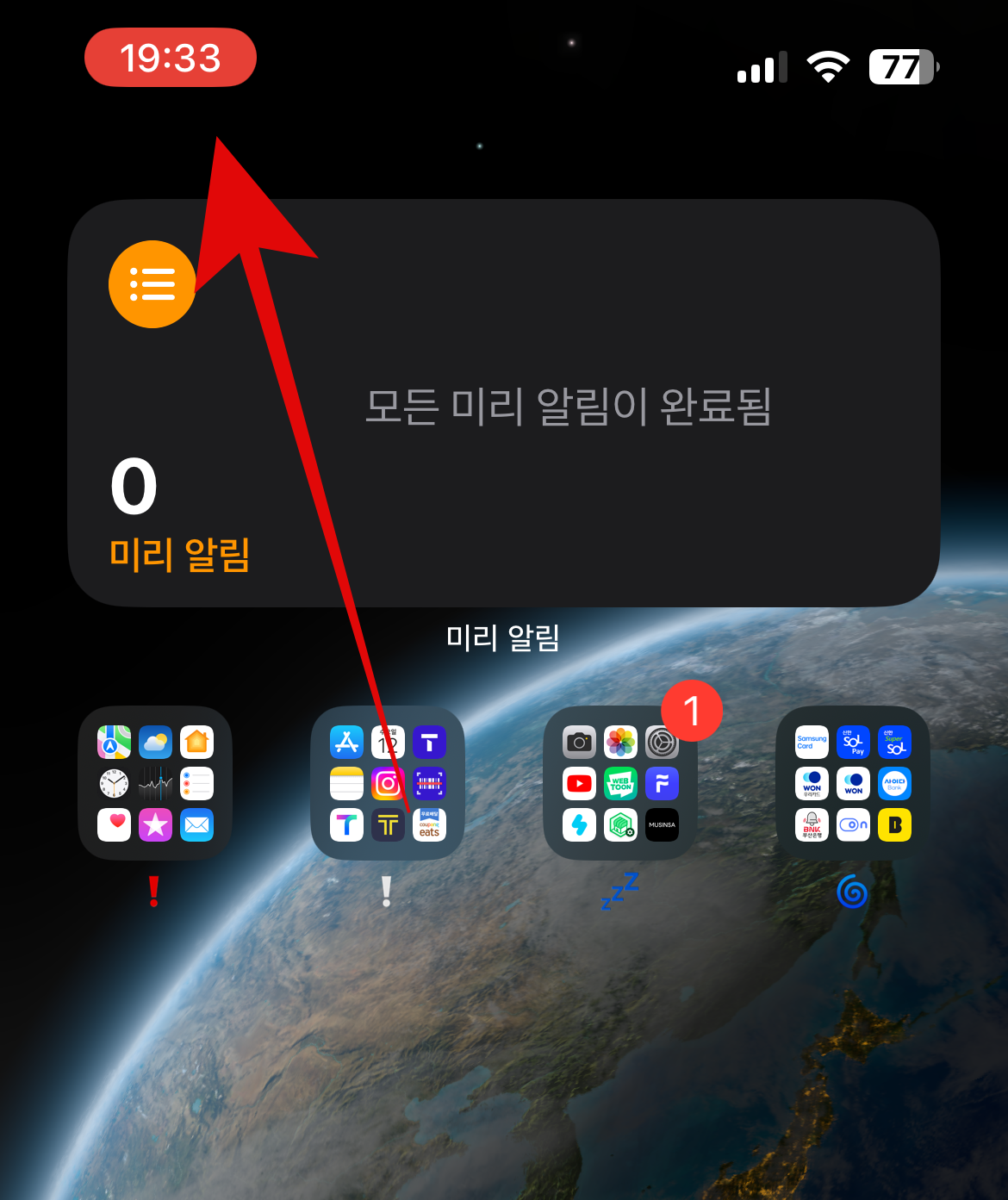 왼쪽 상단을 보면 시계에 빨갛게 불이 들어온 것을 확인할 수 있을 것이다. 이것은 계속 화면이 녹화되고 있다는 표시이며 아이폰 화면녹화를 끝내고 싶을 때 저 버튼을 누르면 아이폰 화면녹화 마무리를 할 수 있다.