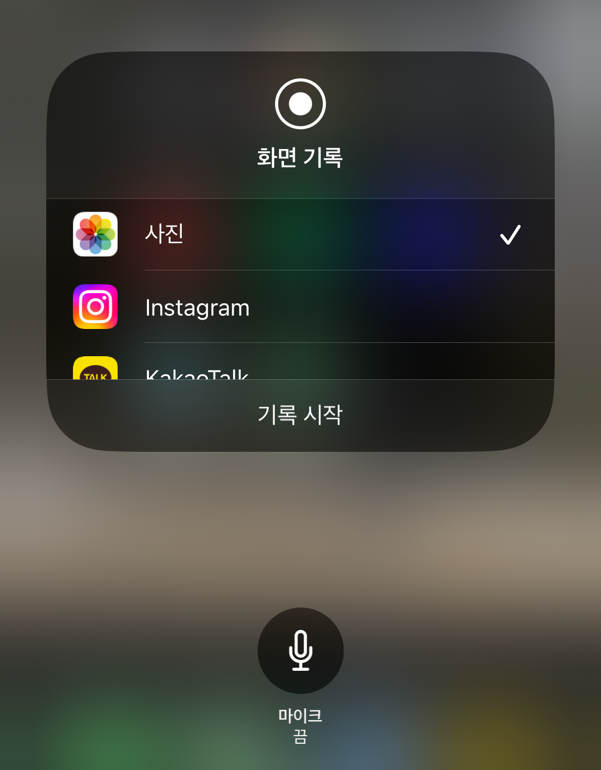 나의 목소리(외부소리)를 같이 녹음하고 싶다면 제어 센터를 열고 화면 녹화 버튼을 꾹 눌러보자. 그러면 하단에 마이크가 꺼져있는 걸 볼 수 있는데 한번 터치하여 마이크를 켜게 되면 외부소리도 함께 녹음이 가능하다.
