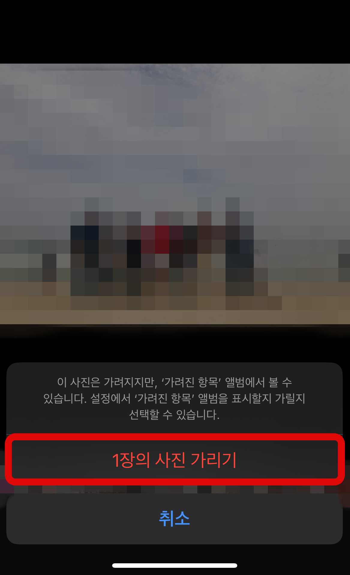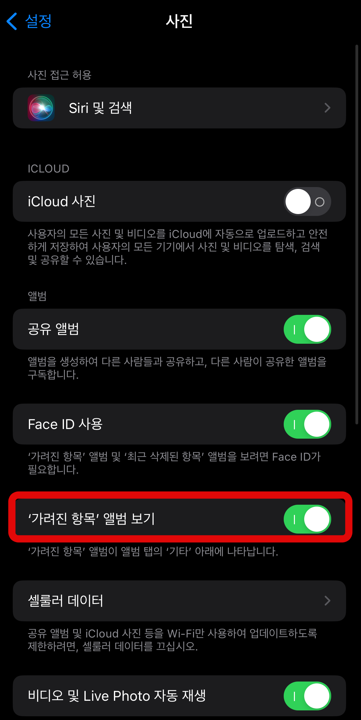 설정에서 스크롤을 쭉 내려 사진탭으로 들어가서 '가려진 항목' 앨범 보기를 끄면 사진첩 앨범에 들어갔을 때에도 가려진 항목이라는 카테고리 자체를 없앨 수 있으니 참고하자. 다시 설정을 하면 언제든 볼 수 있으니 사진이 삭제될 걱정은 안해도 된다.