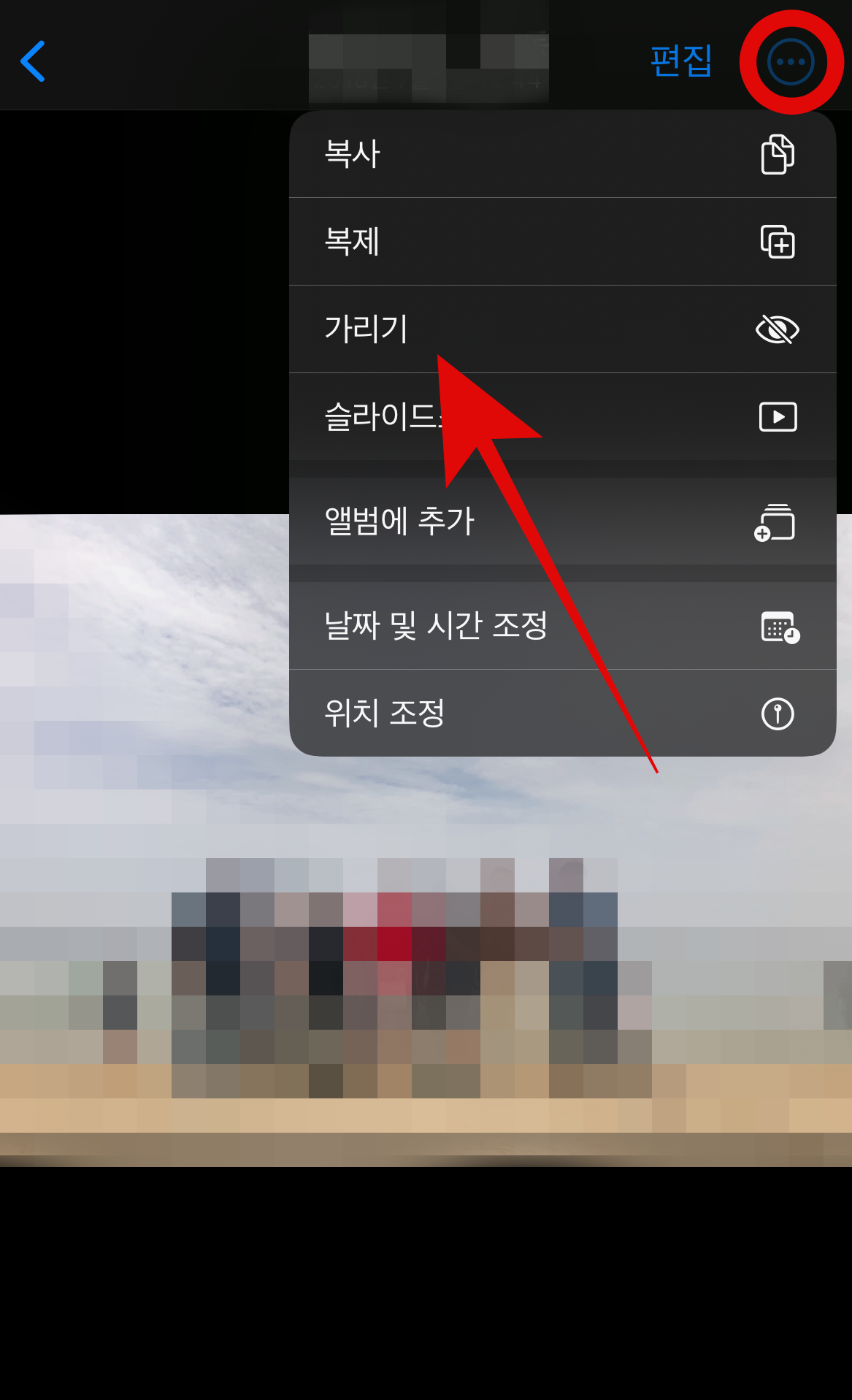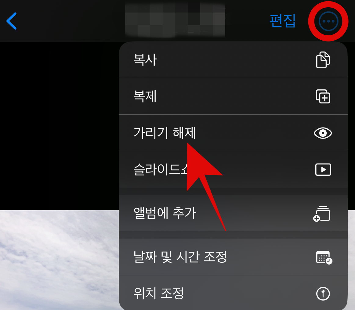 아이폰 사진 숨기기를 해제하고 싶다면 설정했던 방법과 마찬가지로 사진을 선택하여 오른쪽 위에 있는 더보기(...버튼)를 눌러서 가리기 해제를 하면 쉽게 해제가 되어 사진첩에서도 볼 수 있게된다.