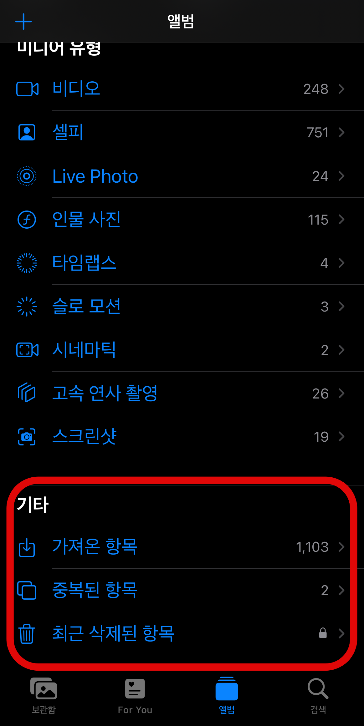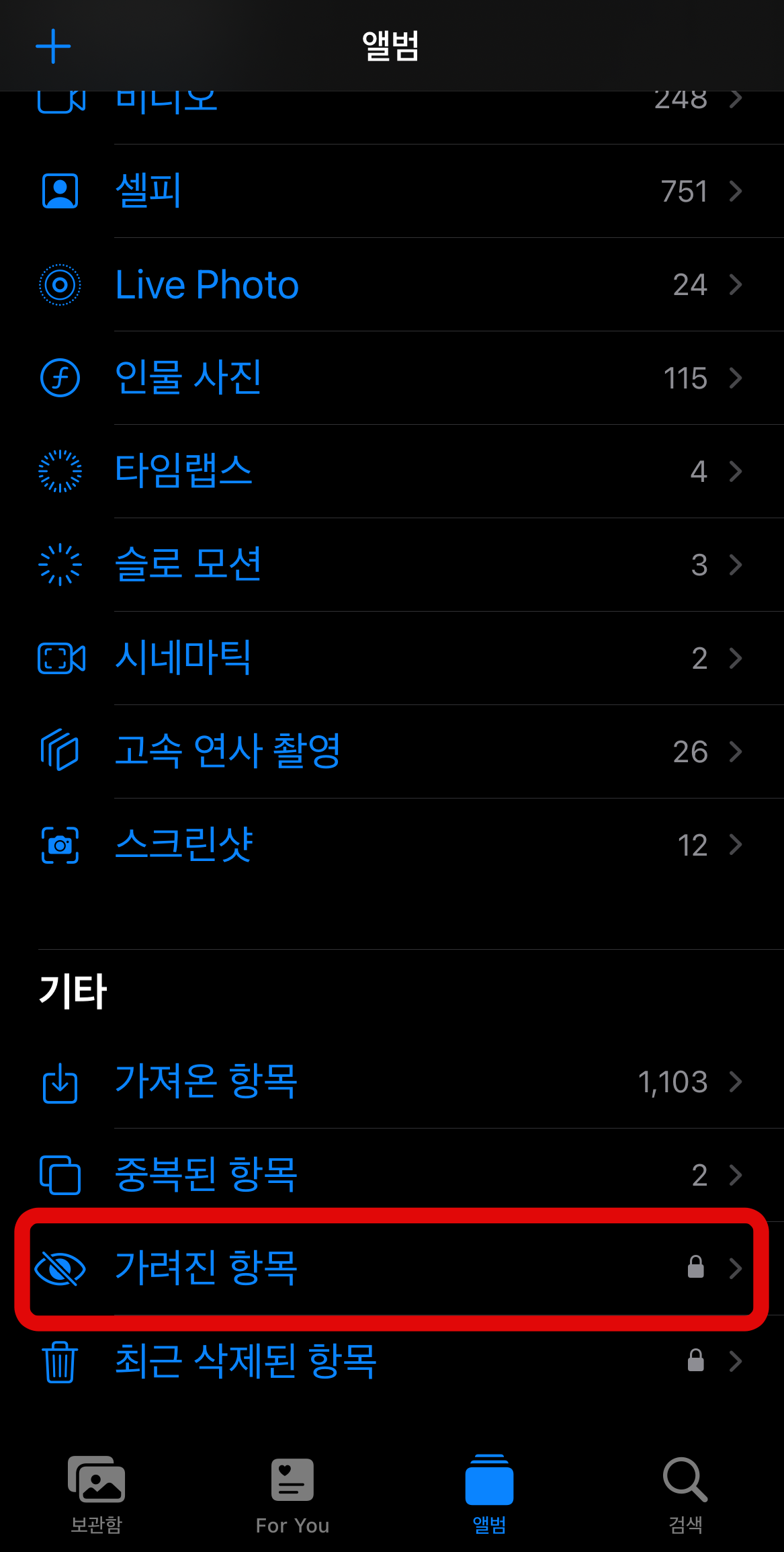 설정에서 스크롤을 쭉 내려 사진탭으로 들어가서 '가려진 항목' 앨범 보기를 끄면 사진첩 앨범에 들어갔을 때에도 가려진 항목이라는 카테고리 자체를 없앨 수 있으니 참고하자. 다시 설정을 하면 언제든 볼 수 있으니 사진이 삭제될 걱정은 안해도 된다.