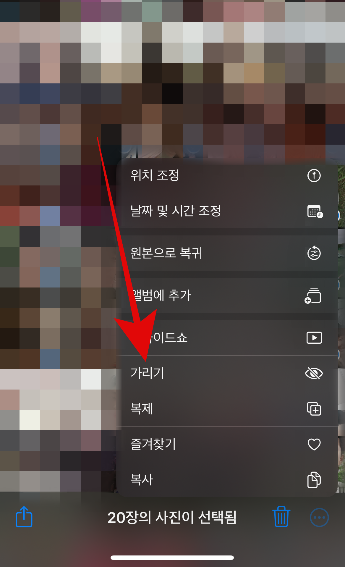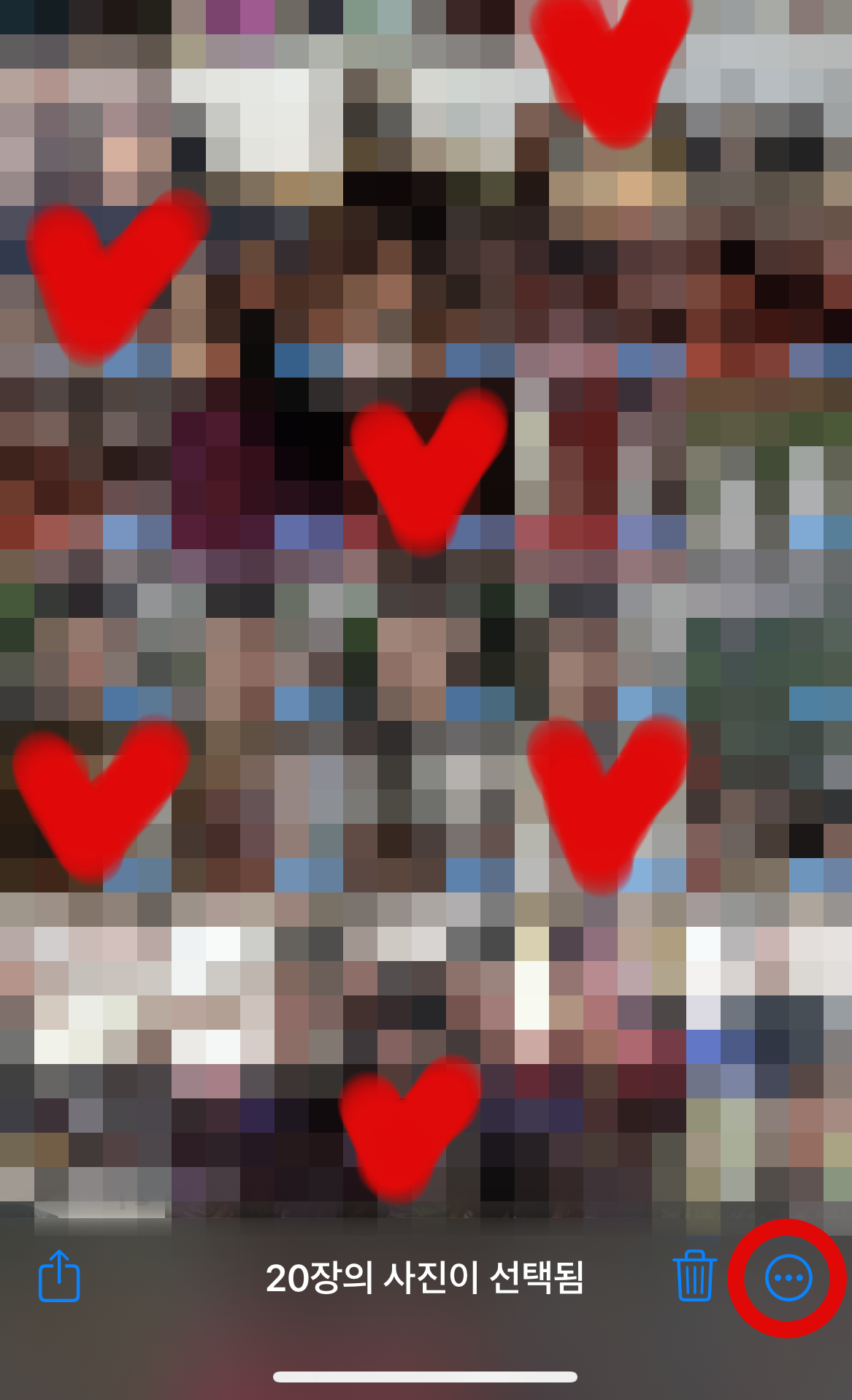 많은 사진을 한번에 숨기고 싶을 때에는 사진첩에 들어가서 오른쪽 위에 있는 선택을 눌러 숨기고 싶은 사진을 모두 선택한다. 그리고 오른쪽 밑에 있는 더보기(...버튼)를 눌러 가리기를 눌러주면 아이폰 사진 숨기기가 더욱 손쉽게 가능하다. 숨긴 사진을 보고싶거나 가리기를 해제하는 방법도 간단하다.