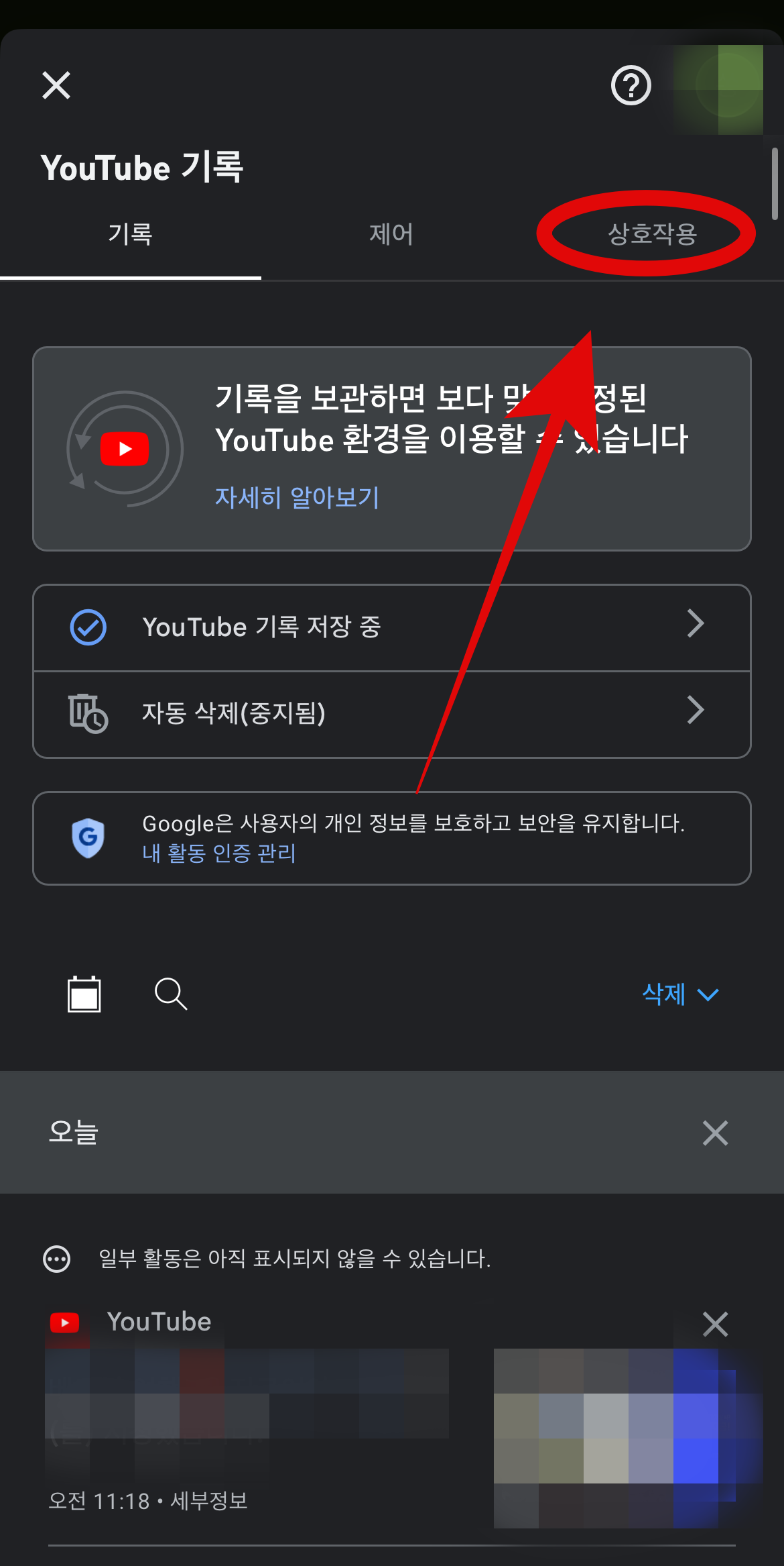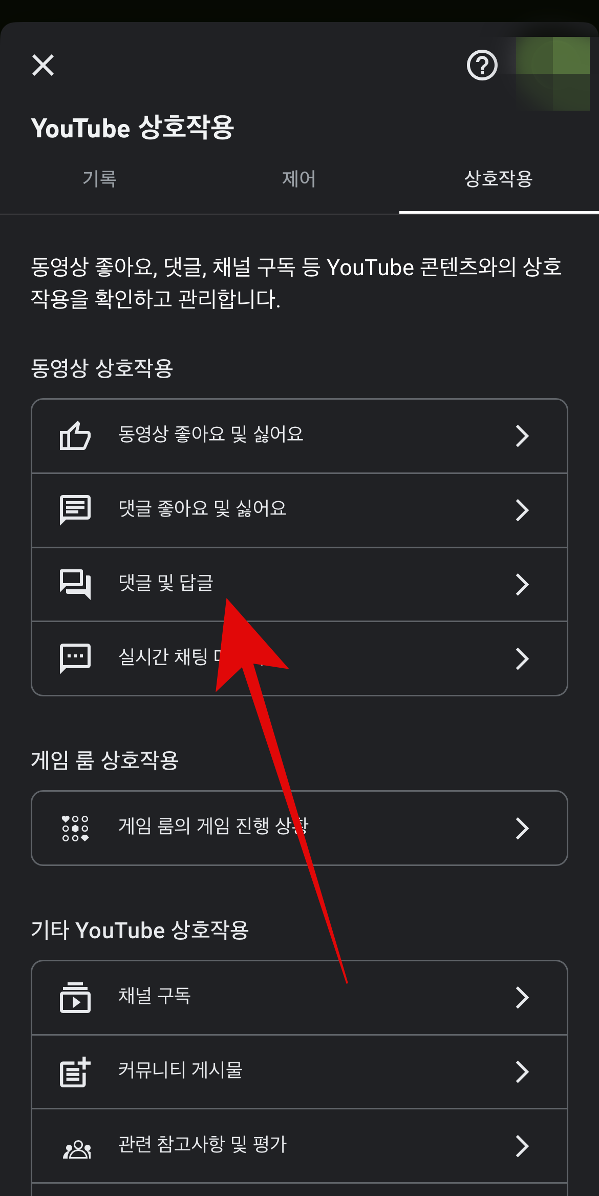 전체 기록 관리로 들어오게 되면 먼저, 시청기록을 확인하고 지울 수 있다. 달력모양을 누르면 날짜별로 설정하여 볼 수도 있으니 참고하도록 하자. 유튜브 내가 쓴 댓글을 확인하고 삭제를 하기 위해서는 오른쪽에 있는 상호작용을 눌러보도록 하자. 상호작용으로 들어가면 내가 쓴 댓글, 답글, 좋아요, 싫어요 등등 내가 활동했던 유튜브 기록들을 관리할 수 있다. 유튜브 내가 쓴 댓글을 확인하고 지우려면 댓글 및 답글로 들어간다.