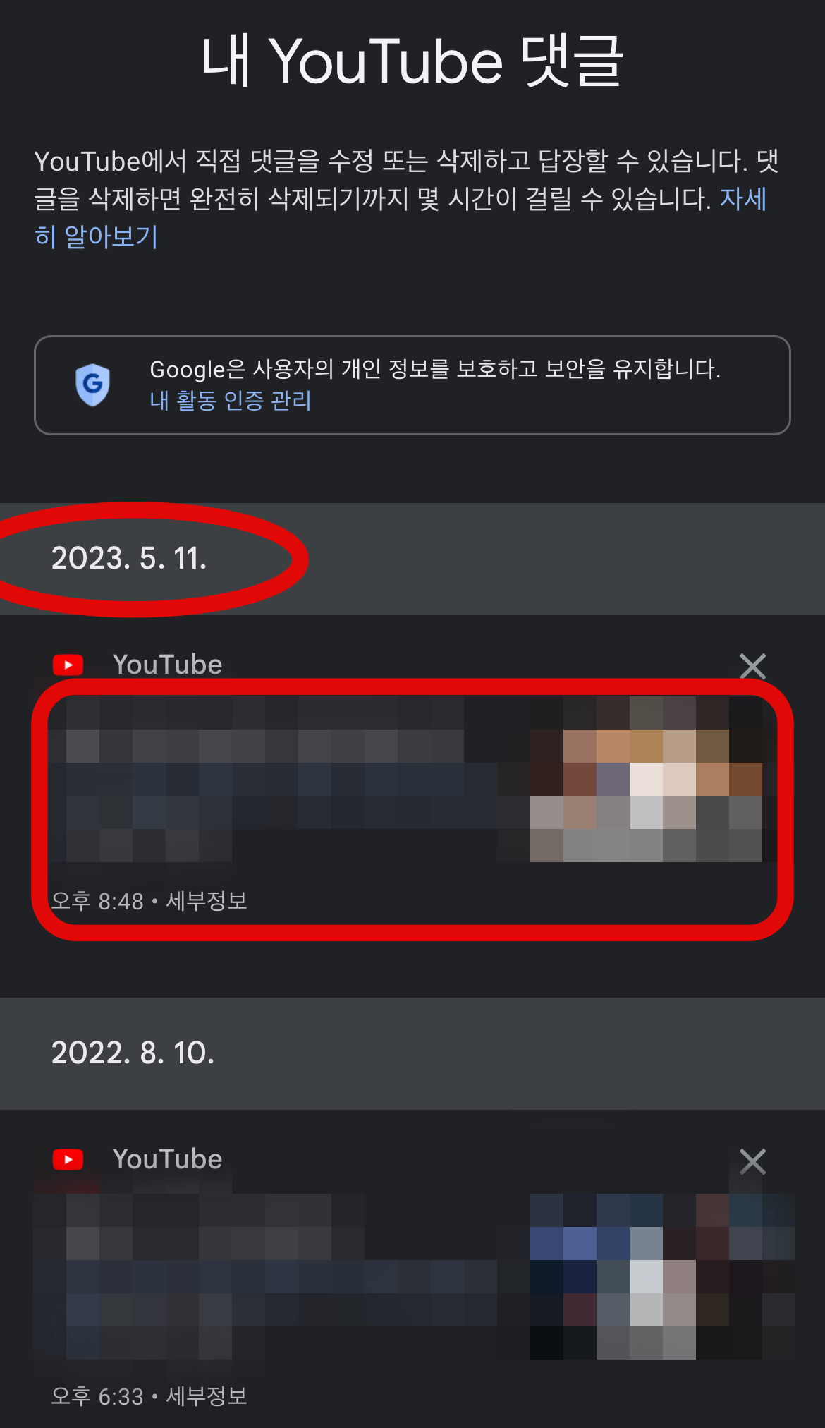 댓글 및 답글에 들어가면 언제, 어느 영상에 뭐라고 댓글을 작성했는지 확인할 수 있다. 유튜브 내가 쓴 댓글을 전체적으로 확인할 수 있으며 오른쪽에 있는 X표시를 누르면 댓글이 삭제된다. 영상을 클릭하면 바로 그 영상을 다시 시청할 수도 있다.