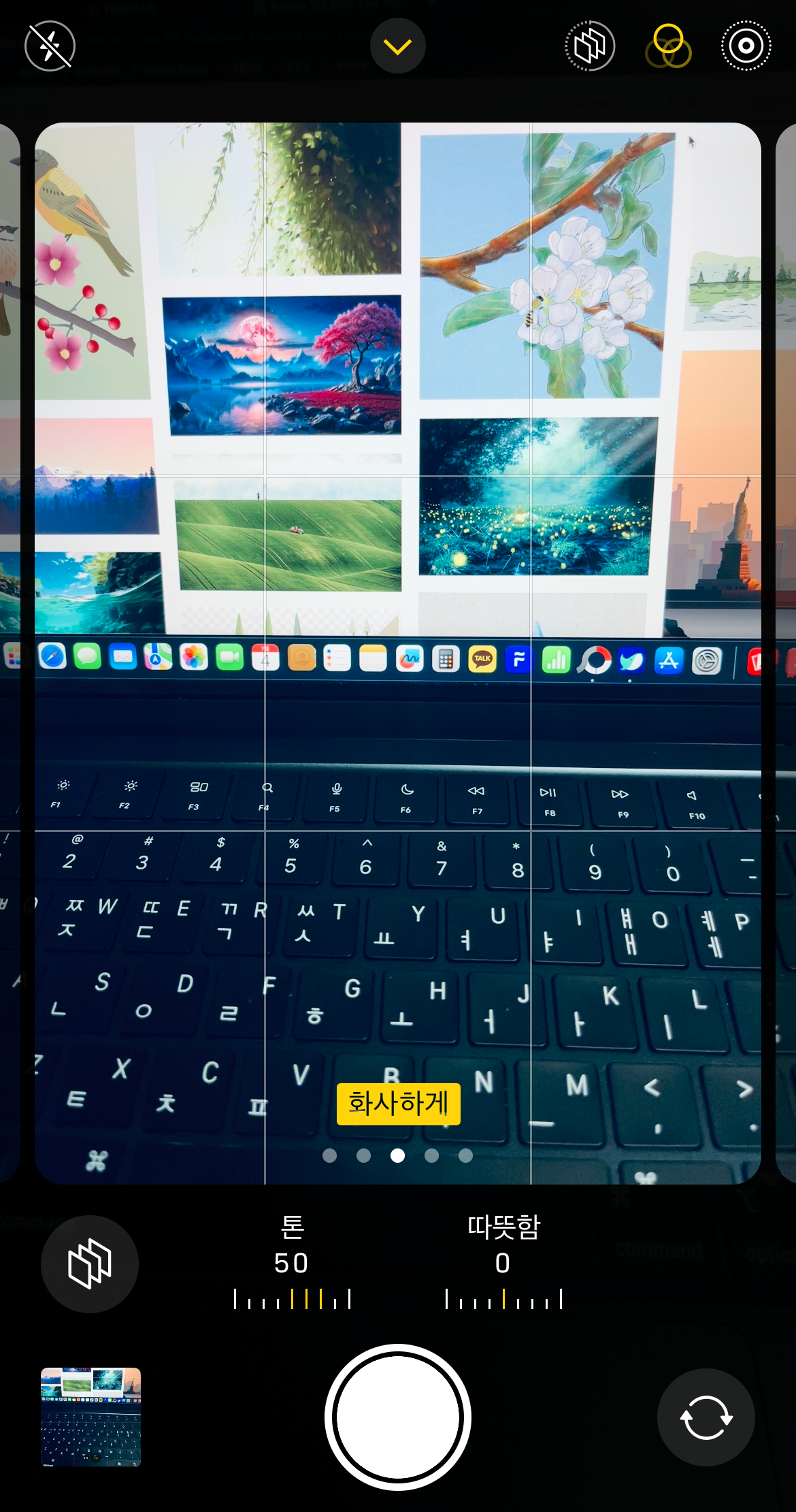 다음으로 확인해볼 사항으로는 애초에 보정이 적용된 채로 사진을 찍는 경우이다. 카메라를 켜서 가운데 위에 있는 화살표를 눌러보자. 아래에 탭이 올라왔을 때 '네모 3개 모양'이나 '동그라미 3개 모양'이 노랗게 불이 들어와 있다면 보정이 된 채로 사진을 찍었을 가능성이 있다.