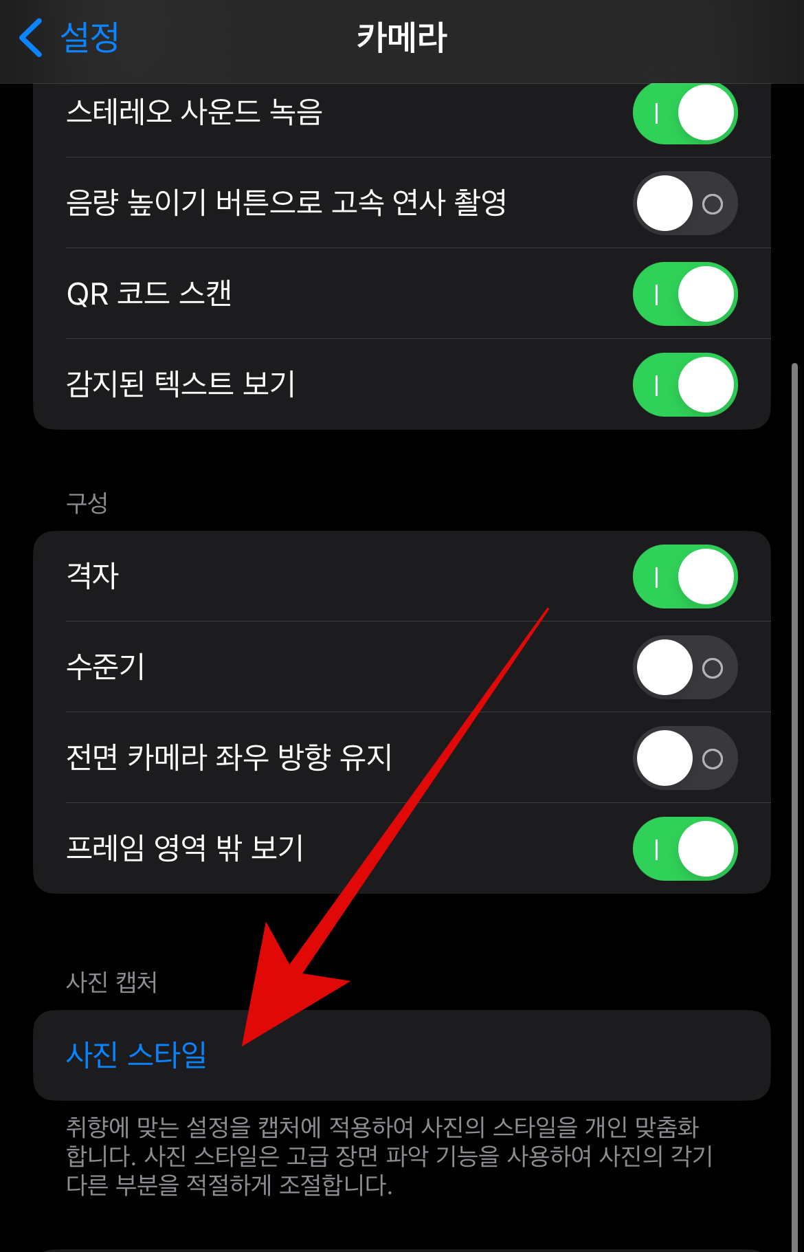 사진스타일 설정을 하기 위해서는 아이폰 설정으로 들어가서 스크롤을 내려 카메라로 들어간다. 카메라탭에서 하단에 사진 스타일이 있는 것을 확인할 수 있을 것이다. 사진 스타일로 들어갔을 때 표준으로 되어있다면 괜찮지만 화사하게나 표준이 아닌 것으로 되어있다면 표준으로 바꾸도록 하자.