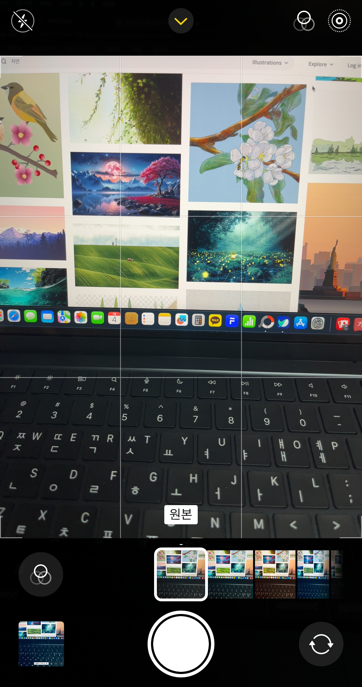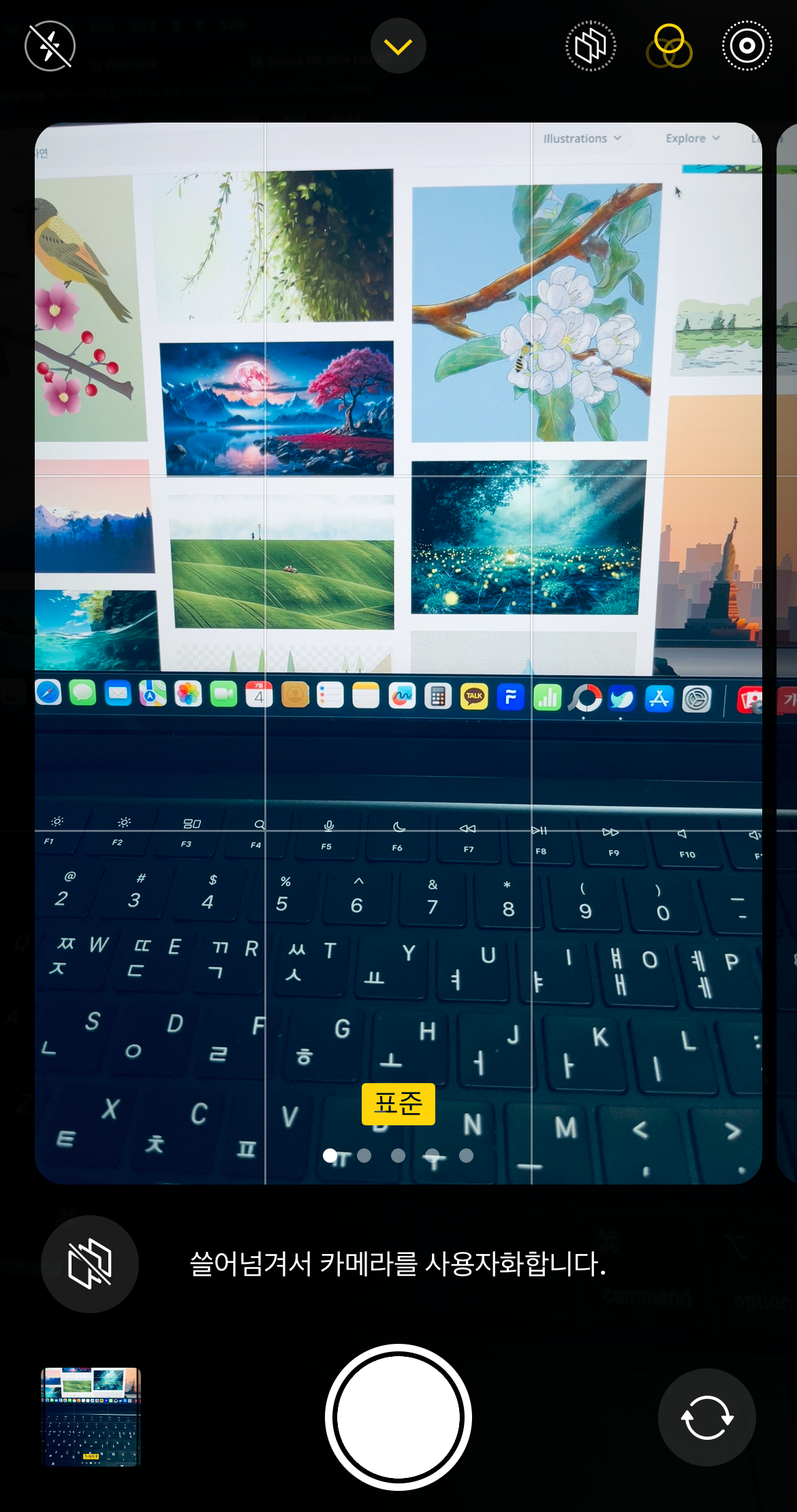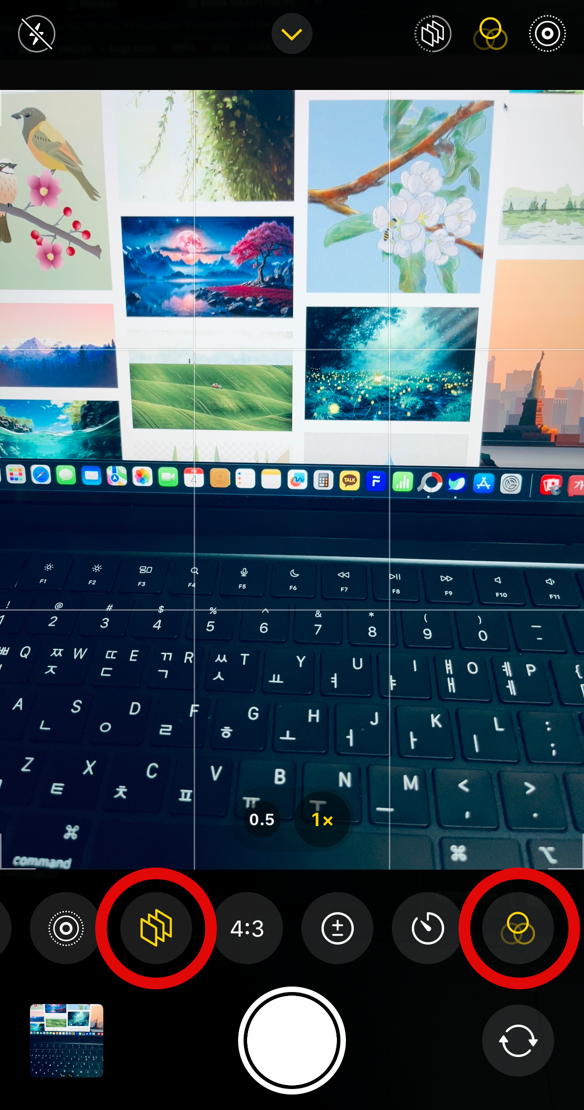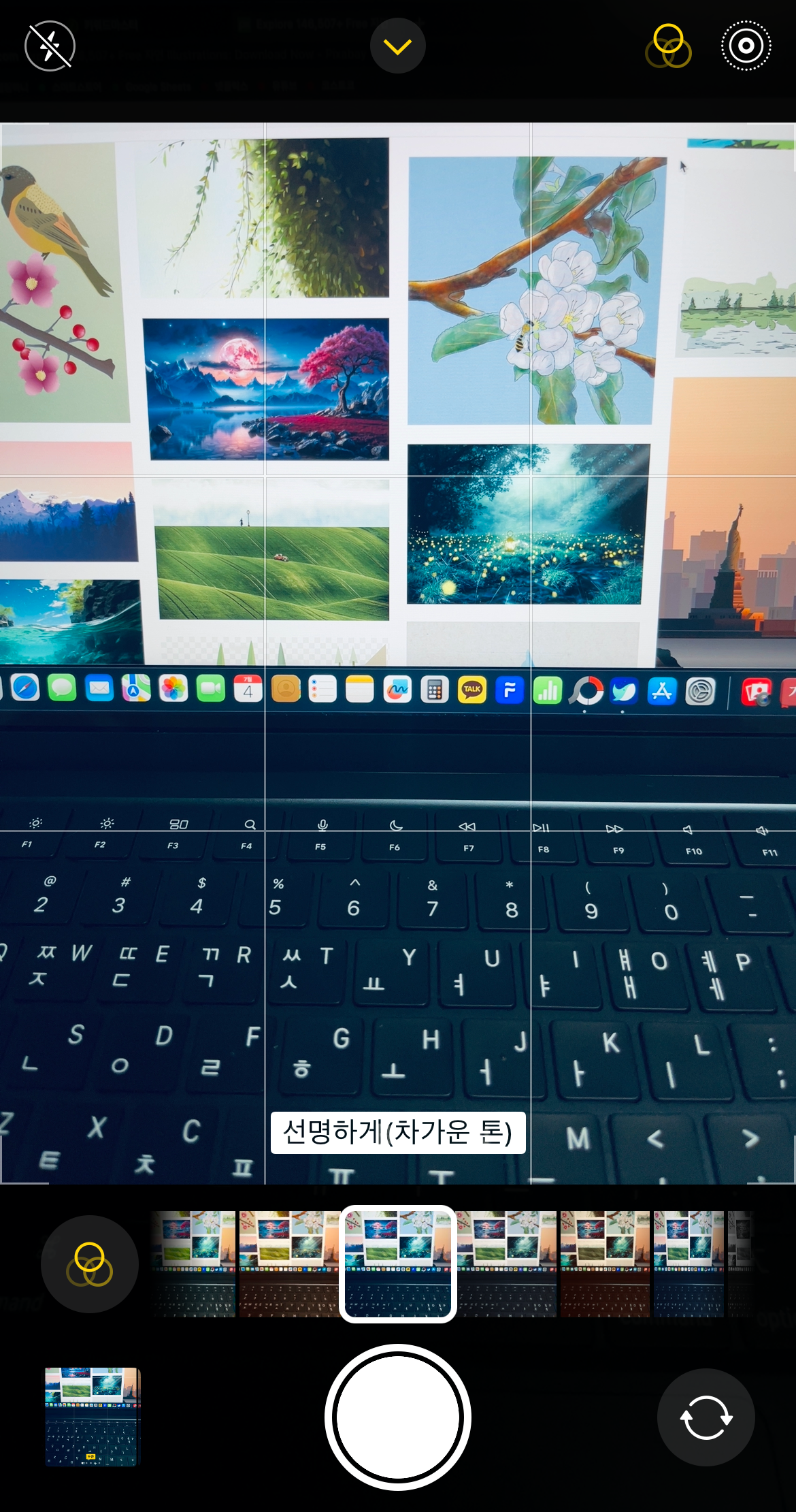 다음으로 확인해볼 사항으로는 애초에 보정이 적용된 채로 사진을 찍는 경우이다. 카메라를 켜서 가운데 위에 있는 화살표를 눌러보자. 아래에 탭이 올라왔을 때 '네모 3개 모양'이나 '동그라미 3개 모양'이 노랗게 불이 들어와 있다면 보정이 된 채로 사진을 찍었을 가능성이 있다.