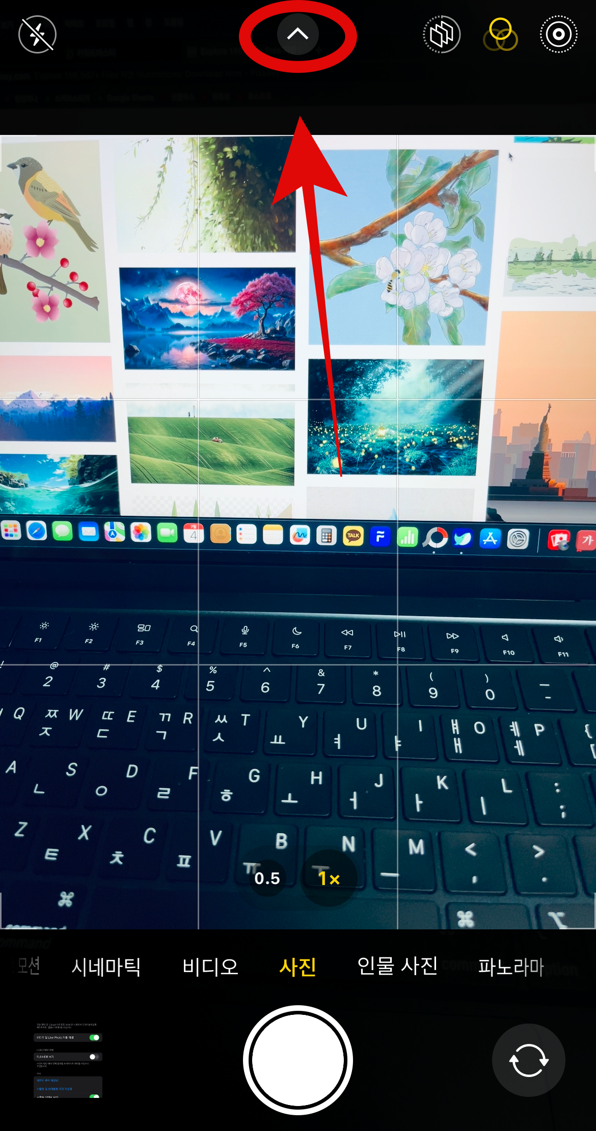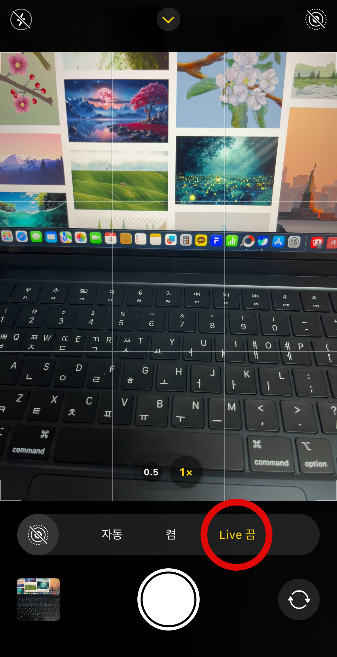 아이폰 자동보정 끄기 마지막 방법으로 라이브포토를 끄는 방법이다. 카메라를 실행시키고 우측상단에 있는 동그라미표시를 꺼보도록 하자.아니면 앞의 방법과 마찬가지로 가운데 있는 화살표를 눌러 꺼도 무관하다. 자동이나 켬으로 되어있는 것을 라이브 끔으로 설정하도록 한다. 이렇게 아이폰 자동보정 끄기에 대한 여러 가지 방법에 대하여 살펴보았다.