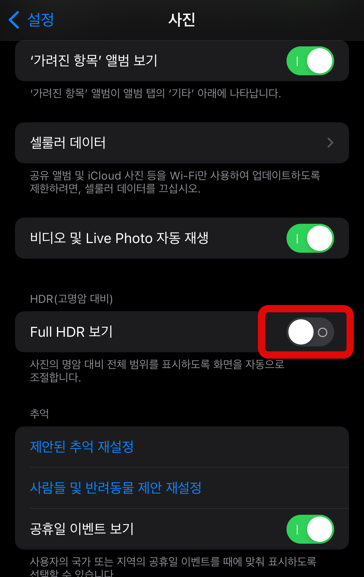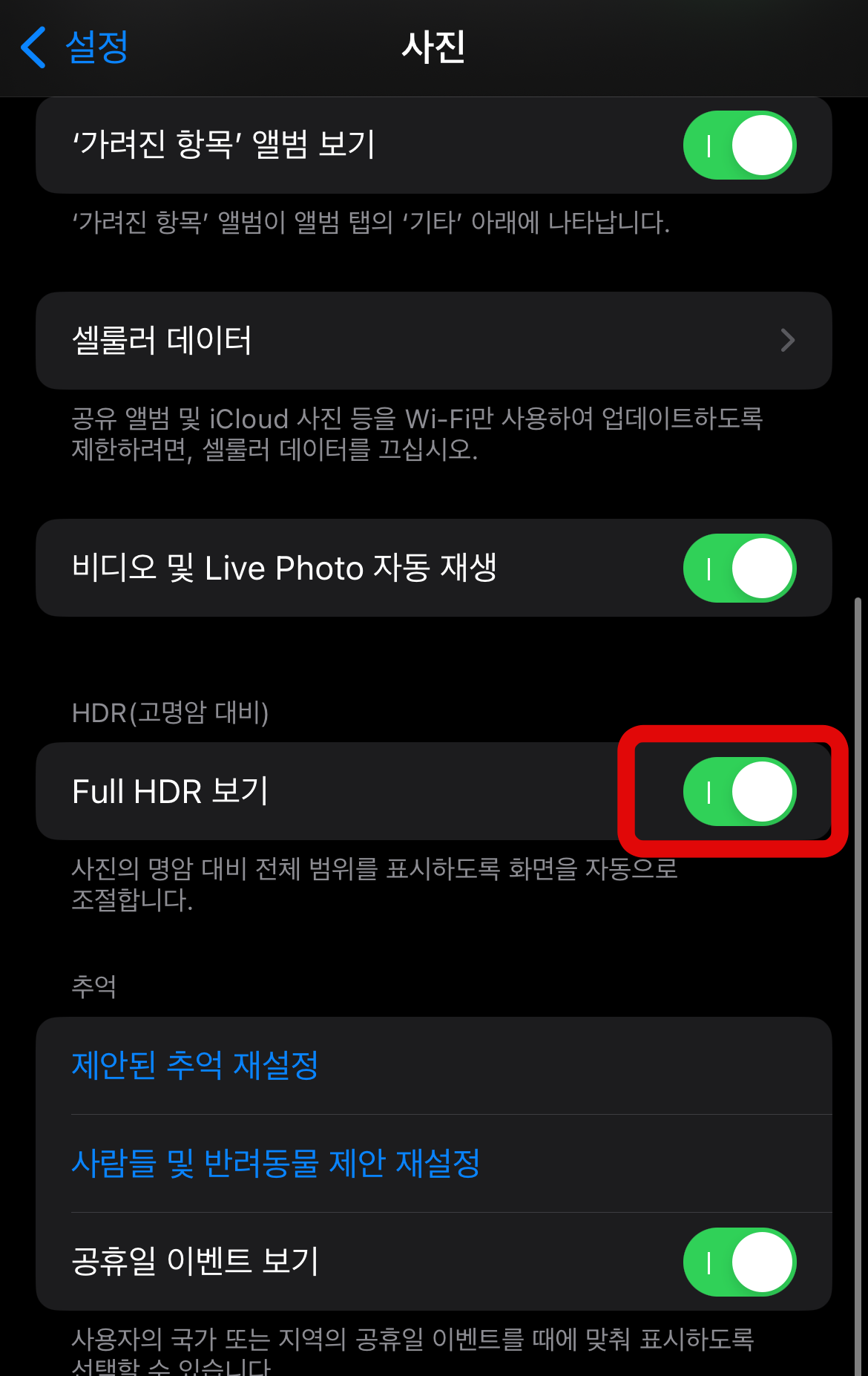 아이폰 자동보정 끄기 다음 방법으로는 가장 중요한 HDR(고명암 대비)을 끄는 것이다. 설정에서 카메라가 아닌 사진으로 들어간다. 스크롤을 조금 내리다 보면 HDR탭에 'Full HDR 보기'가 활성화되어있는 것을 볼 수 있을 것이다. 이 버튼을 눌러 비활성화시켜 주도록 하자. 이 기능은 사진의 명암 대비 전체 범위를 표시하도록 화면을 자동으로 조절하는 기능으로 아이폰 자동보정 끄기에 가장 좋은 방법이다.