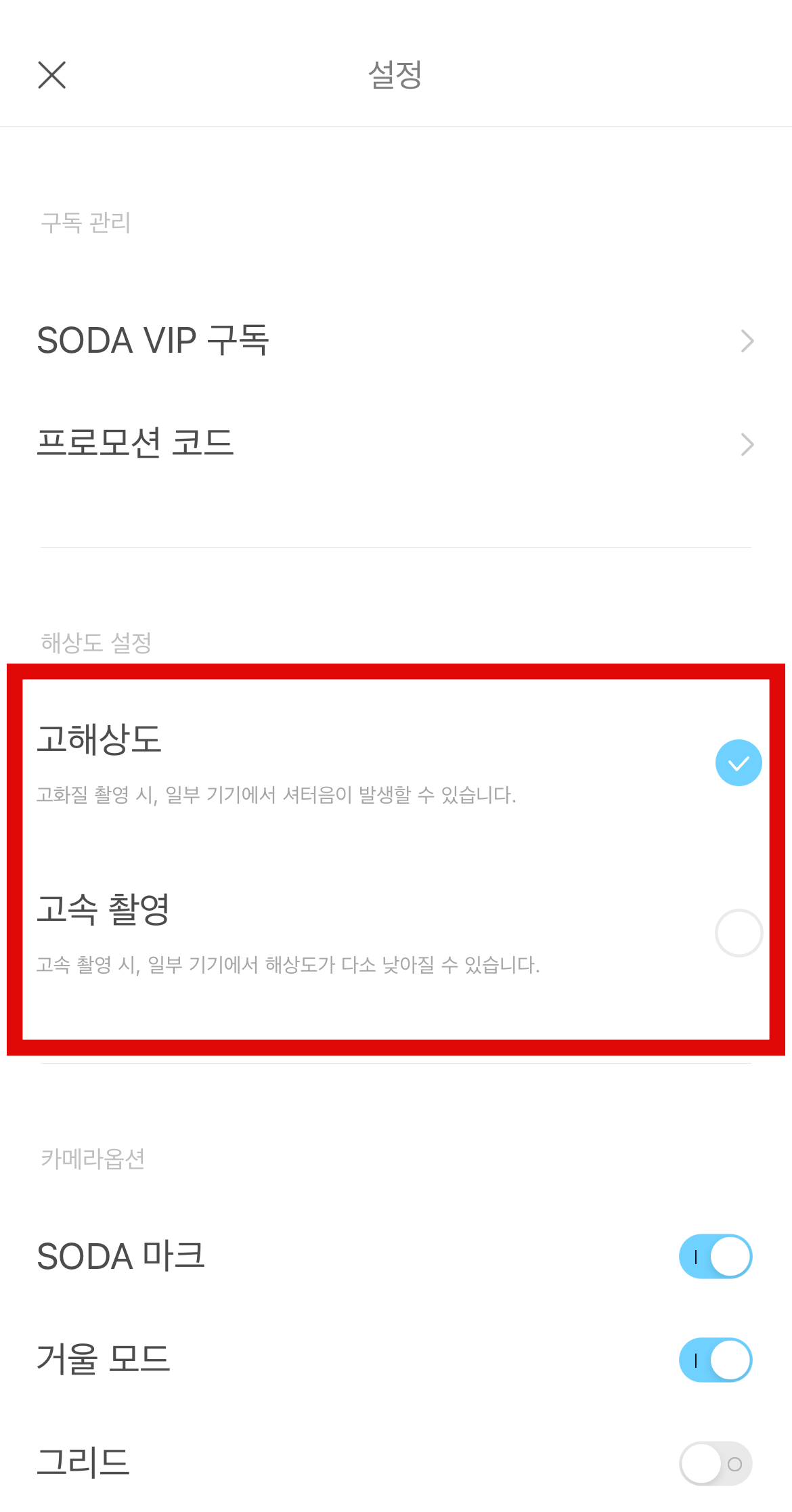 어플을 다운로드하고 사진을 찍어도 소리가 난다면 고화질로 촬영을 해서 소리가 날 수도 있다. 왼쪽 더 보기(점 3개 탭)를 눌러 설정으로 들어가 준다. 중간쯤에 있는 해상도 설정에서 고해상도로 설정되어 있는 것을 고속 촬영으로 변경하여 사진을 찍어보도록 하자. 그러면 아이폰 카메라 소리끄기, 무음으로 사진을 찍을 수 있을 것이다.