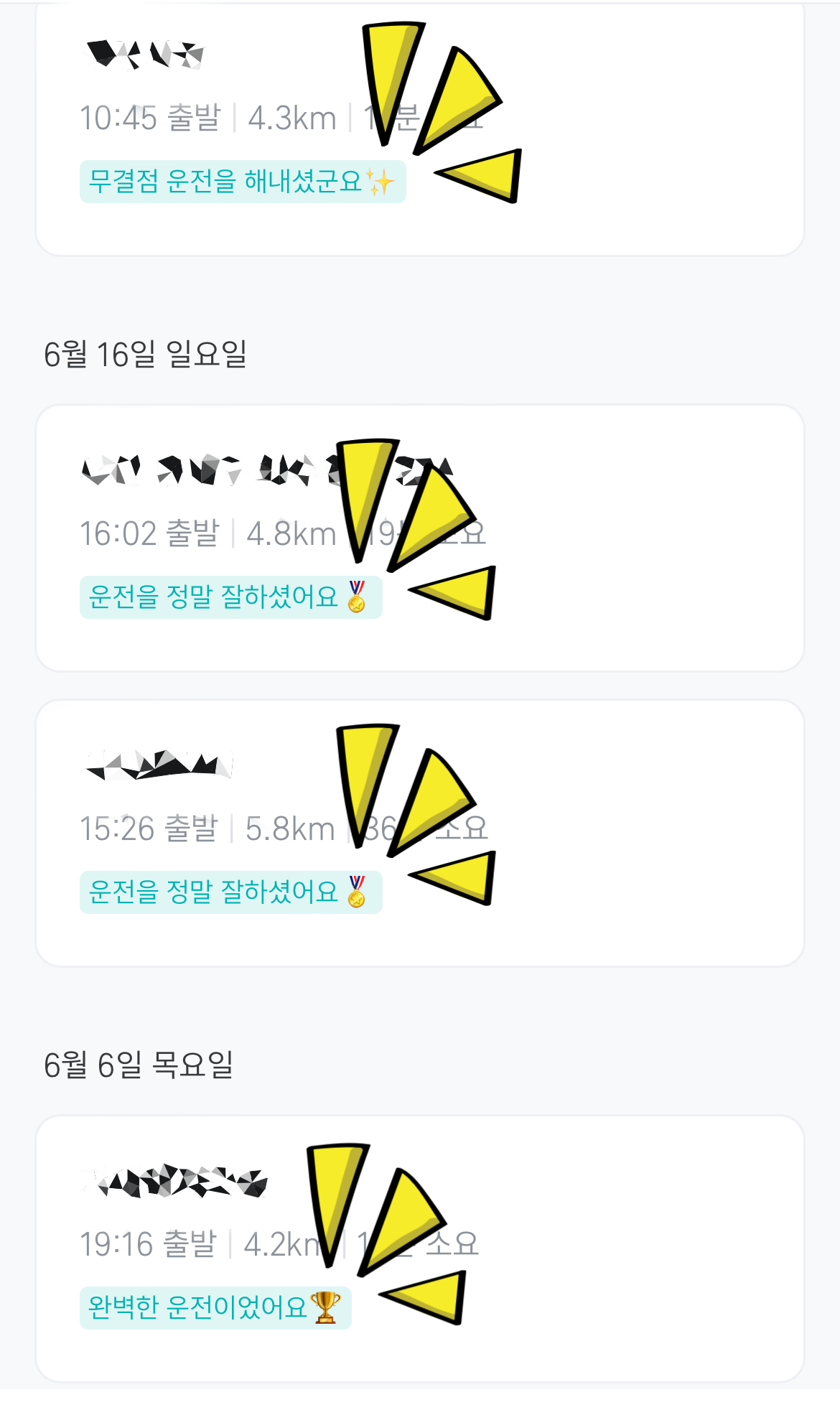 그리고 갑자기 드는 생각으로 대중교통(버스)을 이용할 때 티맵을 켜서 목적지를 찍어두면 무결점 운전이 되지 않을까?...라는 생각을 했지만 굳이 그렇게까지 할 필요 없이 중, 장거리 운행(걸린 시간보다 운행 거리가 더 중요하다고 느껴짐)을 할 때 드라이브를 즐긴다는 생각으로 여유롭게 간다면 충분히 티맵 운전점수 올리기가 원하는 점수까지 가능할 것이다.
