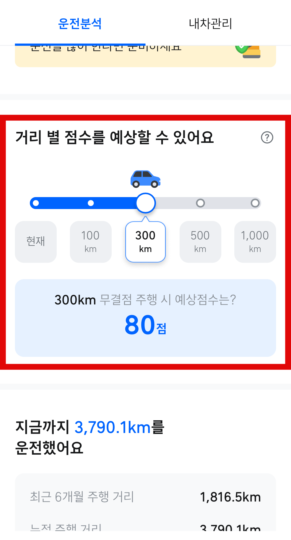 운전분석으로 들어가면 월별 운전점수를 확인할 수 있으며 무결점운전으로 100, 300, 500, 1000km를 운전했을 때 점수가 어떻게 변하는지도 볼 수 있다. 그리고 티맵 운전점수 올리기 위해서는 목적지를 찍고 운전을 하다가 아는 길이 나왔다고 내비를 중간에 끄면 안 된다. 마지막 목적지에 도착하여 내비가 스스로 목적지에 도착했다 하며 종료되어야 운전점수 올리는데 도움이 된다.