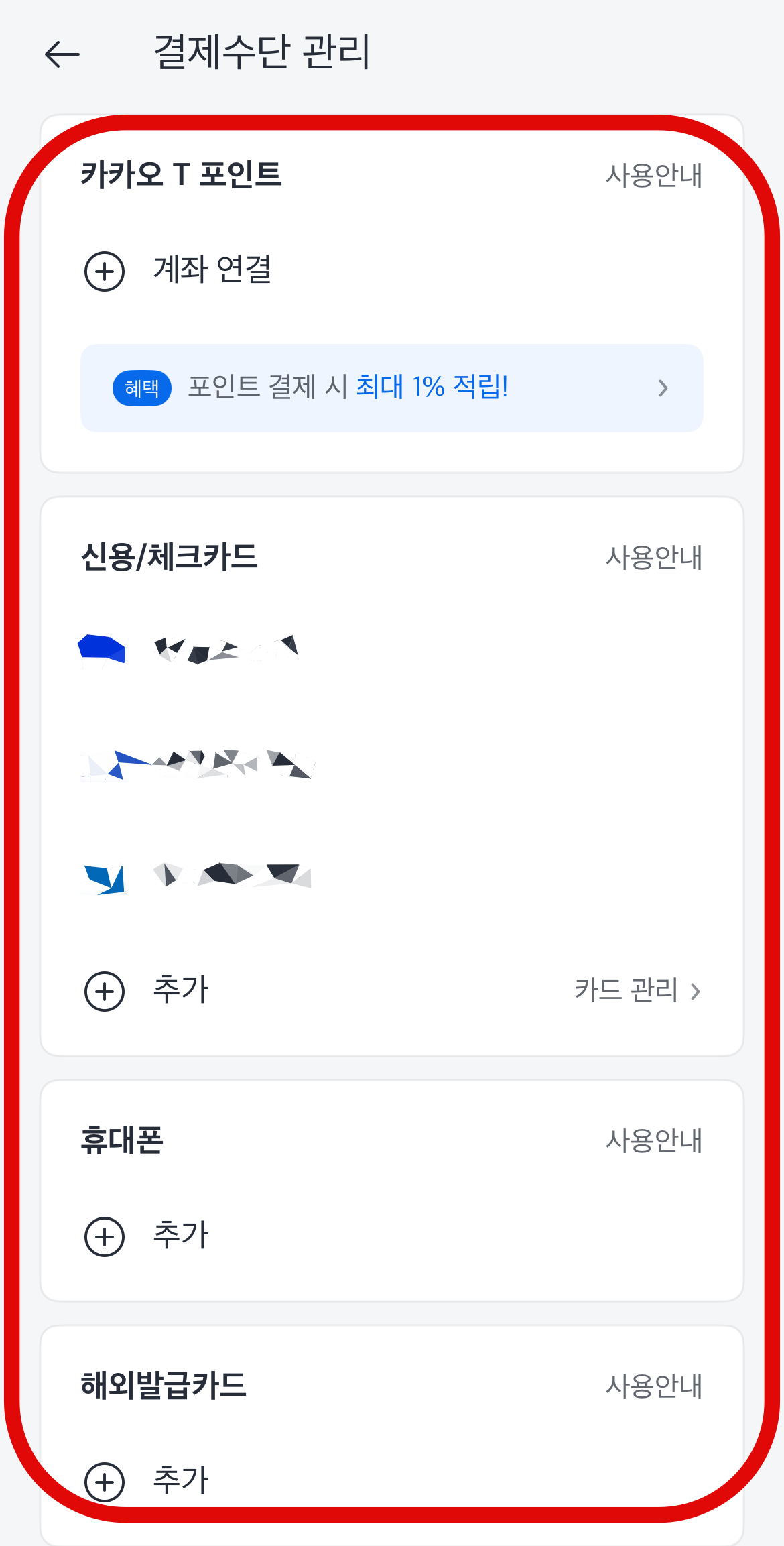 카카오택시 사용법 첫 번째로 결제수단을 추가하는 것이다. 자신이 자주 사용하는 카드나 계좌를 연결시켜 택시 이용이 끝나면 자동으로 결제가 되는 것이다. 혹시 현금을 사용하거나 실 카드를 사용해야 하는 사람이라면 이렇게 추가하지 않고 바로 다음 단계로 넘어가면 된다. 결제수단을 설정해 놓았더라도 도착 후 직접결제로도 변경이 가능하니 굳이 삭제시킬 필요는 없다.