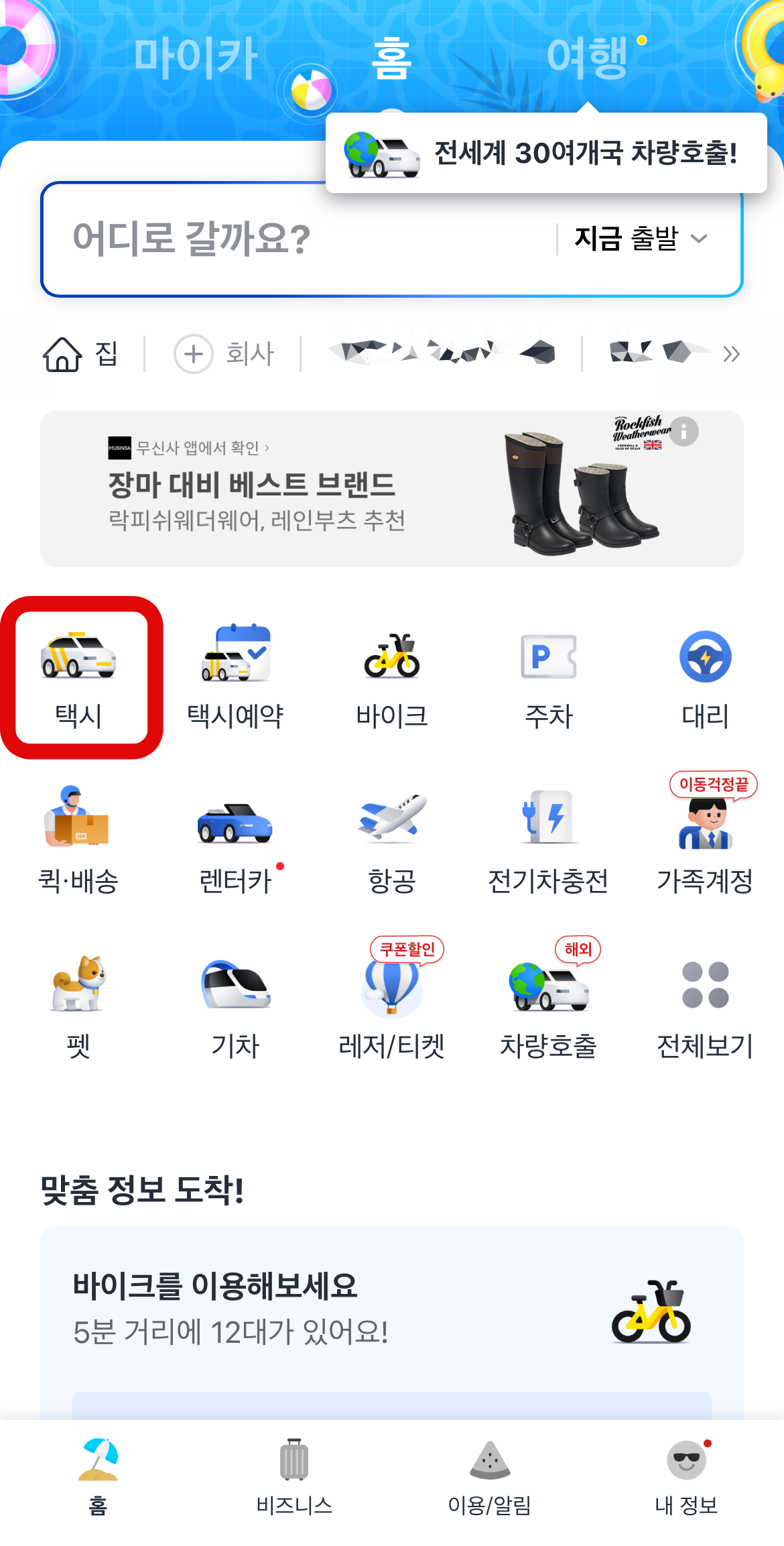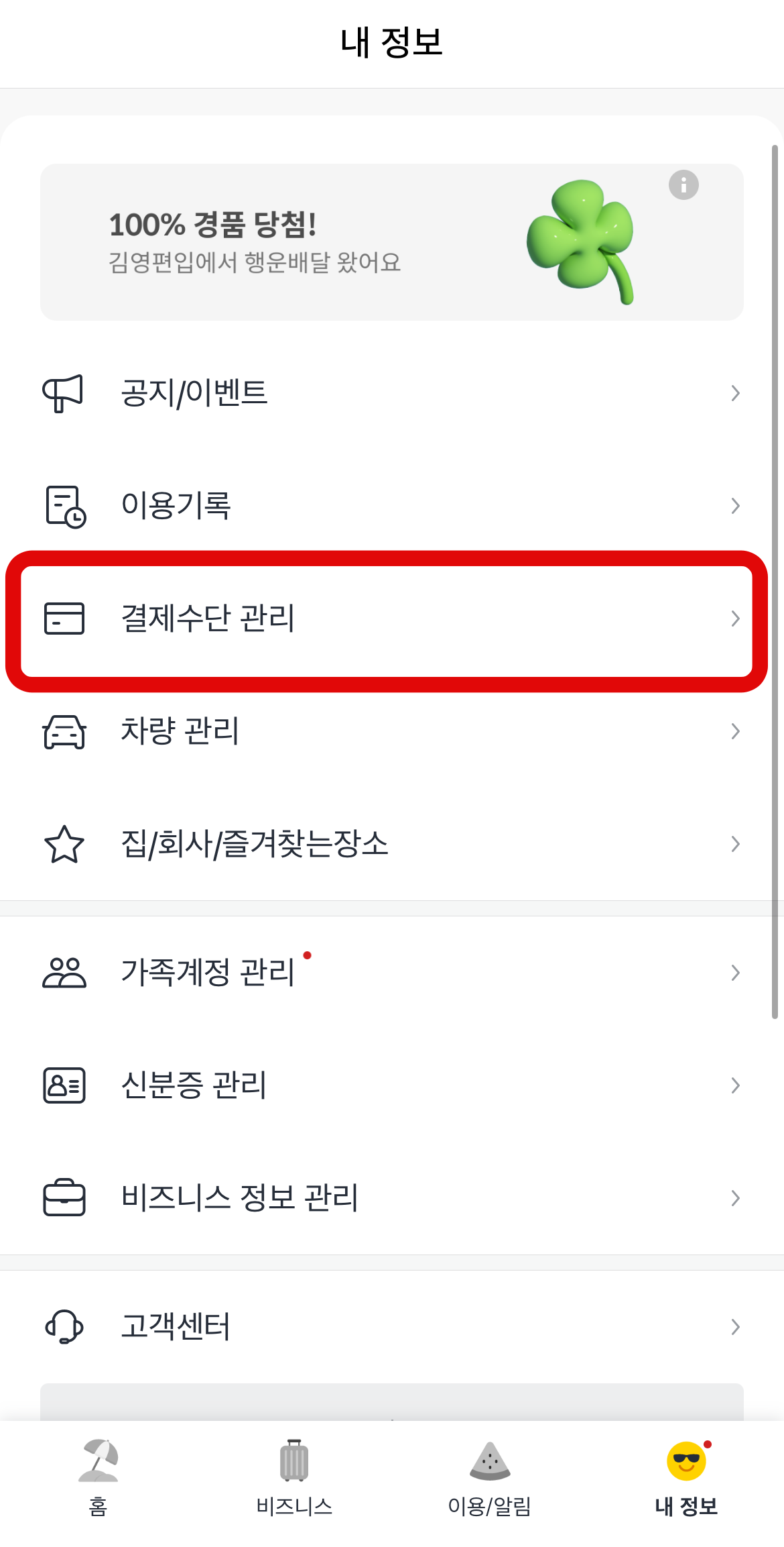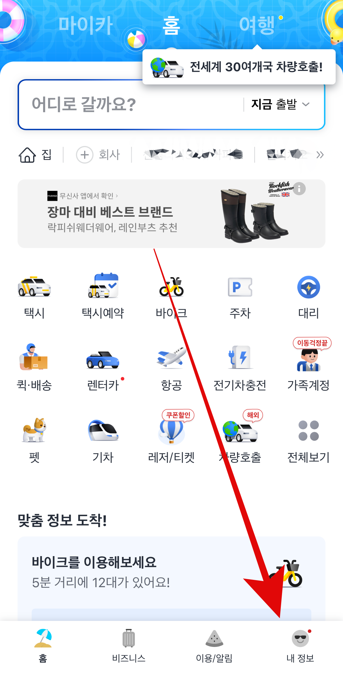 먼저, 카카오T를 다운로드하여 들어간다. 홈 화면에서 택시를 눌러 호출을 해야 하지만 그전에 우측하단에 있는 내 정보로 들어가 보도록 하자. 내 정보로 들어가서 중간쯤에 있는 결제수단관리에 먼저 들어간다. 결제수단을 등록해 놓는 것이 더 편하고 빠르게 카카오택시를 사용할 수 있다.
