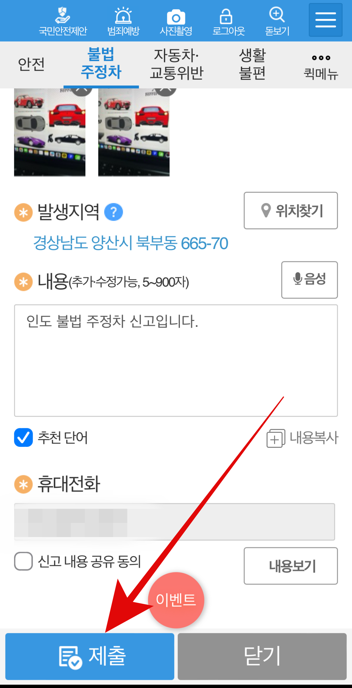 불법주차 신고방법 마지막으로 불법주차를 한 위치를 정확하게 찍어준다. 그리고 휴대전화번호를 입력하고 제출을 눌러주면 된다. 답변이 오는 데에는 1~2주의 시간이 걸리며 문자나 어플의 나의 신고에서 확인할 수 있다. 이렇게 불법주차 신고앱을 통해 신고하는 방법을 알아보았는데 매우 간단하여 누구든 할 수 있을 것이다.