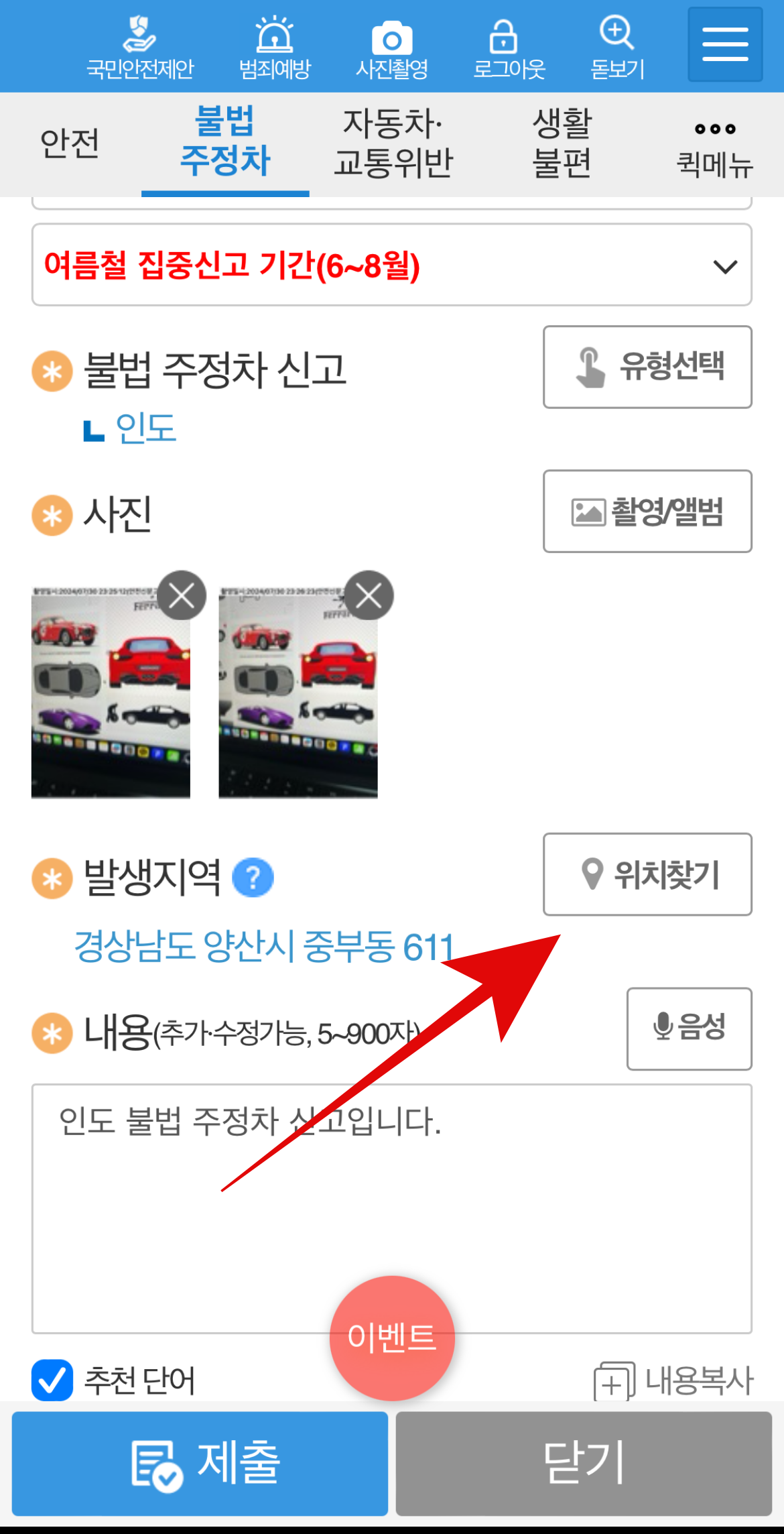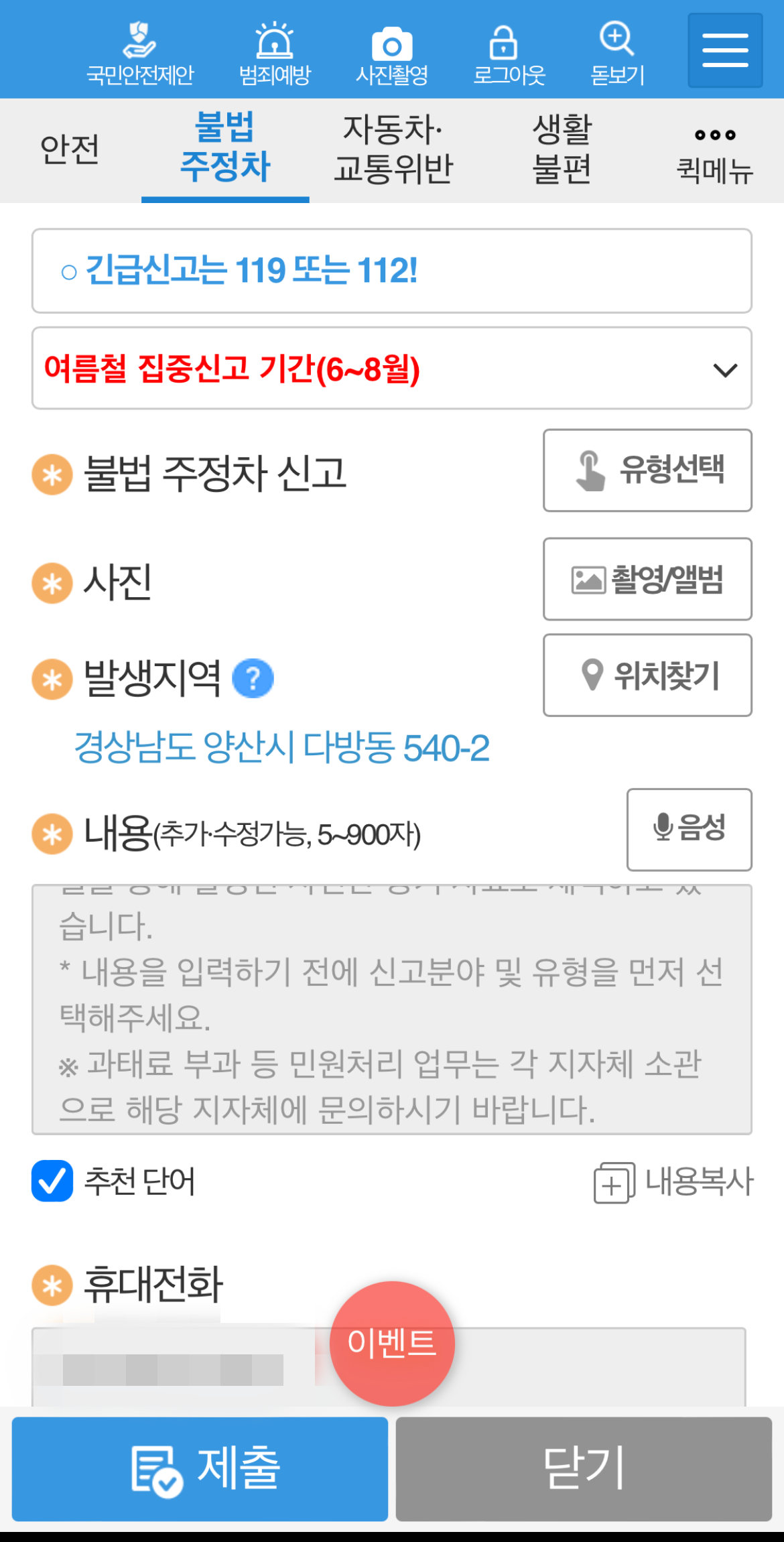 불법주차 신고방법 마지막으로 불법주차를 한 위치를 정확하게 찍어준다. 그리고 휴대전화번호를 입력하고 제출을 눌러주면 된다. 답변이 오는 데에는 1~2주의 시간이 걸리며 문자나 어플의 나의 신고에서 확인할 수 있다. 이렇게 불법주차 신고앱을 통해 신고하는 방법을 알아보았는데 매우 간단하여 누구든 할 수 있을 것이다.