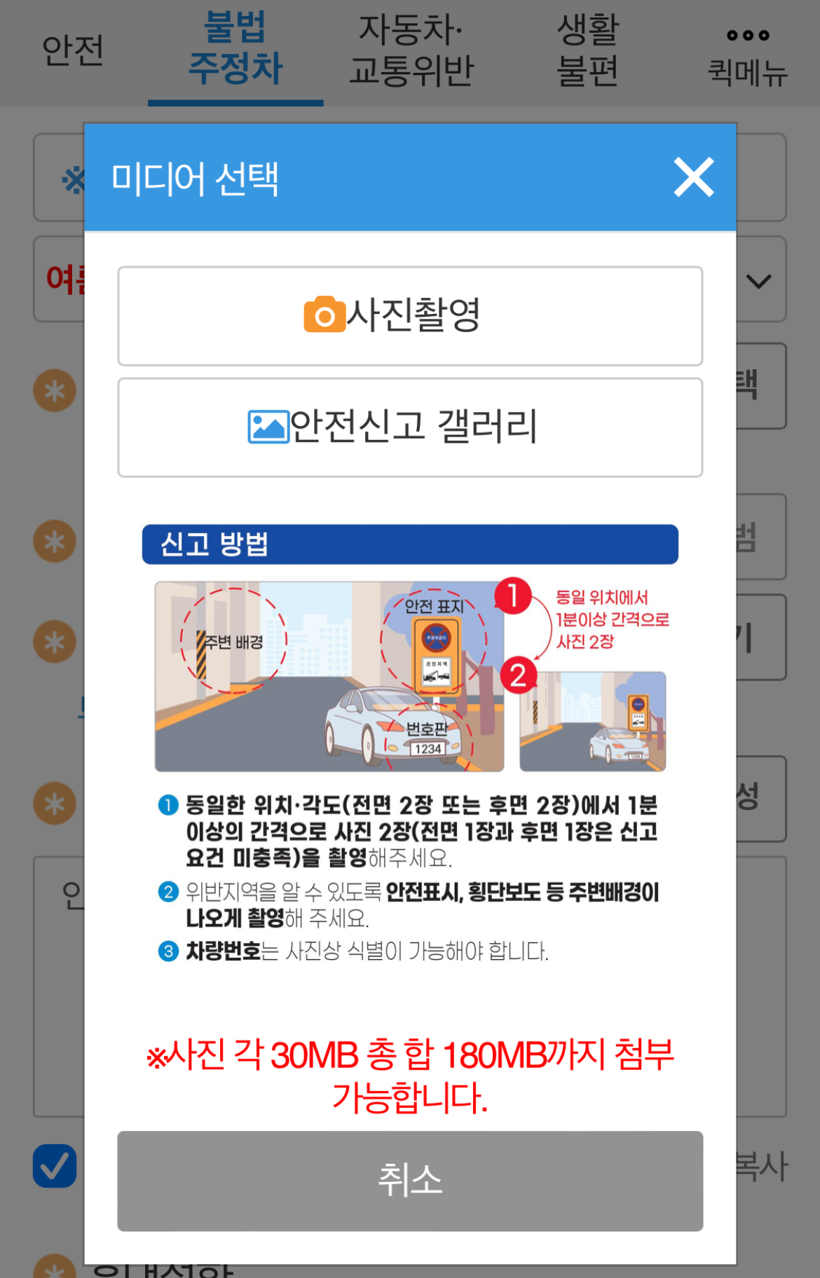 불법주차 신고방법을 알아보기 전에 항상 신고자의 안전한 상태, 상황에서 신고를 하도록 하자. 괜히 시비가 붙거나 다툼이 일어날 수 있고 차량이 지나다니는 곳이면 더욱더 조심하여 자신의 몸을 가장 안전하게 지킬 수 있는 상태에서 신고를 해야 한다. 불법주차 신고는 어플을 통해서 사진을 찍고 1분 있다가 같은 차량을 다시 찍어야 하니 참고하도록 하자.
