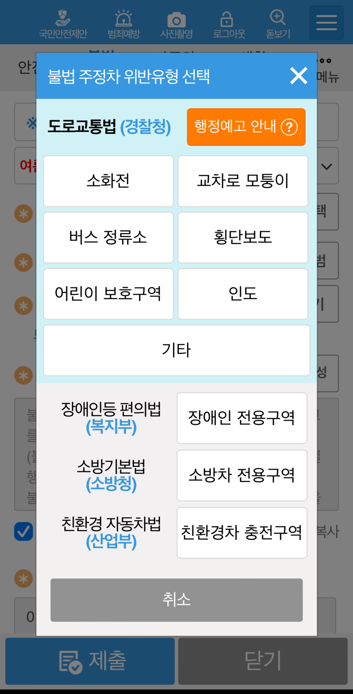 으로 구분되어 있으며 자신이 신고하려고 하는 차량의 위반 유형을 선택하여 눌러준다.