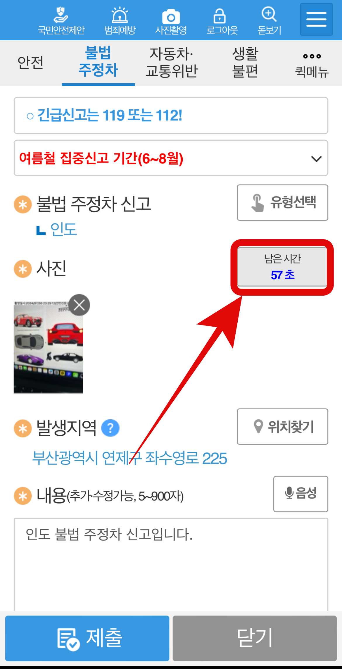주차 위반 유형을 선택했다면 불법주차 신고방법 두번째로 불법주차 차량을 촬영하는 것이다. 어플을 이용해서 촬영을 해야 한다는 점을 꼭 기억해 놓도록 하자. 촬영버튼을 눌러 차량의 사진을 찍어준다. 불법주차를 했다는 것(표지판, 보도)과 차량의 번호판이 보이도록 한 장을 촬영한다. 그러면 60초의 시간이 흐르는 것을 볼 수 있을 것이다. 60초가 지났을 때 다시 촬영 같은 방향으로 사진을 찍어준다.